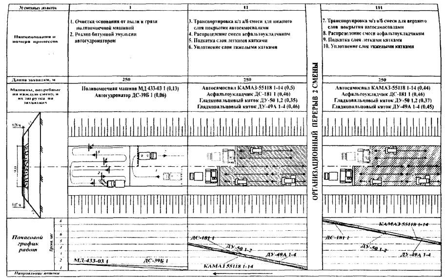 3. БЕЗОПАСНОСТЬ ТРУДА При профилировании основания необходимо руководствоваться схемой профилирования, которая включает в себя детальную разработку каждого прохода автогрейдера. Одновременная работа двух или нескольких автогрейдеров, идущих друг за другом, допускается при соблюдении между ними расстояния не менее 20 м. При развороте автогрейдера в конце профилируемого участка, а также на крутых поворотах дороги движение их должно осуществляться на минимальной скорости. При работе в ночное время у автогрейдера включается освещение, обеспечивающее хорошую видимость фронта работы и рабочих органов. При осмотре автогрейдера двигатель должен быть заглушен, а рабочий орган опущен на грунт. При производстве работ по устройству земляного полотна бульдозером руководствуются следующей технической литературой: 1. СНиП III-4-80. Техника безопасности в строительстве. 2. СНиП 12-03-2001. Безопасность труда в строительстве. Часть 1. Общие требования. 3. ТОИ Р-218-05-93. Типовая инструкция по охране труда для машиниста автогрейдера. 4. ТОИ Р-218-07-93. Типовая инструкция по охране труда для машиниста катка. 5. ТОИ Р-218-26-94. Типовая инструкция по охране труда для машиниста автополивомоечной машины. 6. ТОИ Р-218-06-93. Типовая инструкция по охране труда для машиниста бульдозера. 7. Спельман Е.П. Техника безопасности при эксплуатации строительных машин и средств малой механизации. - М.: Стройиздат, 1986. - 271 с.: ил. Технологическая карта № 15СТРОИТЕЛЬСТВО ДВУХСЛОЙНЫХ АСФАЛЬТОБЕТОННЫХ ПОКРЫТИЙ АВТОМОБИЛЬНЫХ ДОРОГ1. ОБЛАСТЬ ПРИМЕНЕНИЯ Технологическая карта разработана на основе методов научной организации труда и предназначена для использования при разработке проектов производства работ и организации труда на строительном объекте. Технологическая карта составлена на строительство двухслойного асфальтобетонного покрытия шириной 7,5 м с укрепительными (краевыми) полосами по 0,75 м из горячих смесей, отвечающих требованиям ГОСТ 9128-97 «Смеси асфальтобетонные, дорожные, аэродромные и асфальтобетон. Технические условия». Для устройства верхнего слоя покрытия следует применять плотный, а для нижнего слоя - пористый асфальтобетон, обладающий шероховатой поверхностью, обеспечивающей сцепление его с верхним слоем. Верхний слой асфальтобетонного покрытия принят 6 см, нижний - 7 см в соответствии с Типовыми проектными решениями серии 503-0-11 «Дорожные одежды автомобильных дорог общей сети». В технологической карте принят механизированный способ выполнения работ с применением асфальтоукладчика ДС-181, автомобилей-самосвалов КамАЗ-55118 и гладковальцовых катков. Покрытия из горячих асфальтобетонных смесей устраивают в сухую погоду весной и летом при температуре воздуха не ниже 5 °С, осенью - при температуре воздуха не ниже 10 °С. Во всех случаях применения технологической карты необходима привязка ее к конкретным условиям производства работ. 2. ОРГАНИЗАЦИЯ И ТЕХНОЛОГИЯ ПРОИЗВОДСТВА РАБОТ 2.1. До начала работ по строительству асфальтобетонного покрытия должно быть полностью закончено строительство дорожного основания и принято представителями технического надзора органа управления. 2.2. Работы по строительству двухслойного асфальтобетонного покрытия в данной технологической карте ведутся поточным способом по разработанной технологической последовательности производства 
