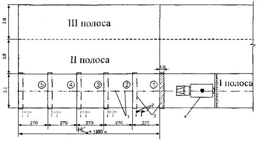 2.3. Скорость потока (длина сменной захватки) 1350 м/смену определена из условия, при котором объем вяжущего для основного розлива равен вместимости цистерны автогудронатора ДС-142Б, составляющей 7500 л. 2.4. На первой захватке выполняют следующие технологические операции: · очистка покрытия от пыли и грязи; · подгрунтовка покрытия битумной эмульсией. 2.4.1. Покрытие очищают от пыли и грязи за два прохода по одному следу поливомоечной машины типа МД-433-03. В первую очередь производят очистку самого покрытия, затем за один проход по каждой обочине пыль и мусор удаляют на откосы. 2.4.2. Подгрунтовка покрытия выполняется битумной эмульсией из расчета 0,8 - 1,2 л/м2 и должна быть закончена не менее чем за 4 ч до розлива вязкого битума. Этого времени достаточно для полного испарения воды после распада битумной эмульсии. Подгрунтовку вяжущим свежеуложенного асфальтобетонного покрытия можно исключить, если поверхность его чистая. 2.5. На второй захватке выполняют основные технологические операции по устройству одиночной поверхностной обработки на вязких битумах: · розлив вяжущего; · транспортировку черненого щебня; · распределение черненого щебня; · укатку поверхностной обработки. 2.5.1. В зависимости от ширины покрытия, а также технических характеристик автогудронатора и распределителя щебня определяют число и ширину устраиваемых полос. В данном конкретном случае при ширине проезжей части 7,5 м с учетом двух краевых полос по 0,75 м при общей ширине покрытия 9 м целесообразно устраивать 3 полосы по 3 м, что соответствует ширине распределения материала щебнераспределителем WS 4100 Vario. 2.5.2. Розлив вязкого битума для основного слоя выполняют автогудронатором ДС-142Б. Расход вяжущего на 1 м2 обрабатываемой поверхности не должен превышать 0,5 - 0,7 л при использовании черненого щебня фракции 10 - 15 мм и 0,7 - 0,9 л, если применяется черненый щебень фракции 15 - 20 мм. Этого количества вяжущего достаточно, чтобы заполнить щебеночное пространство на высоту, равную примерно 2/3 диаметра щебенок, обеспечивающую надежное сцепление с покрытием и исключающую выпотевание битума в период высоких летних температур. Температура битума во время розлива должна быть: - для марок БНД 60/90, БНД 90/130 в пределах 130 - 160 °С; - для марки БНД 130/200 в пределах 100 - 130 °С. 2.5.3. Сменную захватку разбивают на участки розлива битума (рис. 1). Рис. 1. Схема разбивки сменной захватки на участки розлива битума: I - III - полосы распределения материала; 1 - разбивка оси полосы распределения; 2 - сигнальные флажки в конце участка розлива; 3 - защитный слой; 4 - автогудронатор Длину этого участка целесообразно назначать, увязывая почасовые графики работы автогудронатора с распределителем щебня на захватке с учетом запаса производительности автогудронатора (рис. 2). На захватке длиной 1350 м время работы щебнераспределителя составляет 3,12 ч, автогудронатора ДС-142Б - 1,68 ч. Интервал между этими операциями в конце захватки составит 1,44 ч, что недопустимо, поскольку распределенный битум за такой промежуток времени остывает и, как следствие, теряет свою подвижность и клеящую способность. Для предотвращения остывания битума необходимо предусматривать остановки автогудронатора через каждые 270 м на 0,28 ч (~ 17 мин), которые целесообразно совмещать с вынужденными остановками для загрузки щебнераспределителя. 2.5.4. Автогудронатор устанавлива
