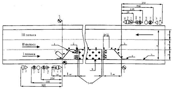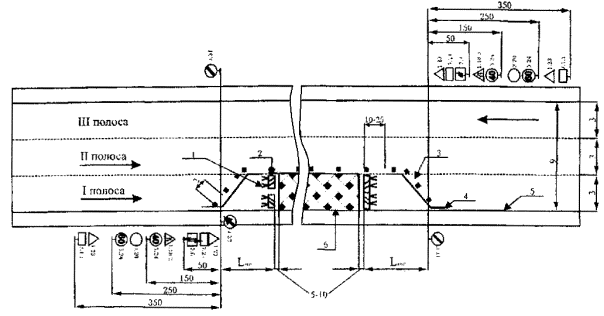 Россыпь щебня по заданной норме достигается регулированием скорости вращения шнеков, барабана, выдающего материал, и скорости передвижения распределителя на первом пробном участке россыпи за 1 - 2 попытки. Вслед за распределением щебня исправляют дефектные места. В местах, где образовались излишние скопления вяжущего (жирные пятна), скребком срезают слой щебня с эмульсией, из леек распределяют вяжущее, засыпают это место новым щебнем и распределяют его слоем в одну щебенку. 2.5.6. Прикатку щебня наиболее целесообразно выполнять катком на пневматических шинах за 4 - 5 проходов по одному следу с нагрузкой на колесо не менее 1,5 т и давлением в шинах 0,7 - 0,8 МПа. Для одноразмерного щебня достаточно двух проходов по одному следу. Задача укатки - уложить и прижать щебень к вяжущему. Лучшая шероховатость слоя обеспечивается прикаткой пневматическим катком, исключающим дробление или вдавливание щебня в основу. Для предотвращения прилипания смеси в процессе укатки вальцы катков смачивают водой, смесью воды и керосина (1:1) или 1-процентным водным раствором соапстока. 2.5.7. При устройстве поверхностной обработки в рамках ремонта автомобильной дороги необходимо обеспечить бесперебойное движение транспорта. В этом случае дорожные работы следует производить сначала на I полосе ремонтируемого участка, пропуская транспорт по II и III полосам, затем поочередно закрывают II и III полосы, организовывая движение по двум свободным (рис. 2). 2.5.8. Движение при наличии объезда закрывают на сутки, при его отсутствии - на 8 ч. В течение первых 2 - 3 сут эксплуатации необходимо ограничивать скорость движения автомобилей до 40 км/ч и регулировать его по ширине проезжей части. Уход за поверхностной обработкой состоит в наметании сброшенных щебенок, исправлении сухих мест и углублений, в добавке вяжущего, а в местах избытка вяжущего - в добавке мелкого «белого» щебня. 2.6. Технологическая последовательность процессов по устройству двойной поверхностной обработки с применением катионных битумных эмульсий с расчетом объемов работ и потребных ресурсов приведена в табл. 2, 4. Рис. 2. Схема размещения технических средств организации движения в местах производства дорожных работ: I - III - очередность устройства поверхностной обработки; 1 - сигнальные фонари или световозвращающие элементы; 2 - ограждающие барьеры; 3 - направляющие конусы; 4 - разметка проезжей части; 5 - кромка краевой укрепительной полосы; 6 - зона дорожных работ; Lотг - длина отгона зоны дорожных работ Таблица 4 Состав отряда