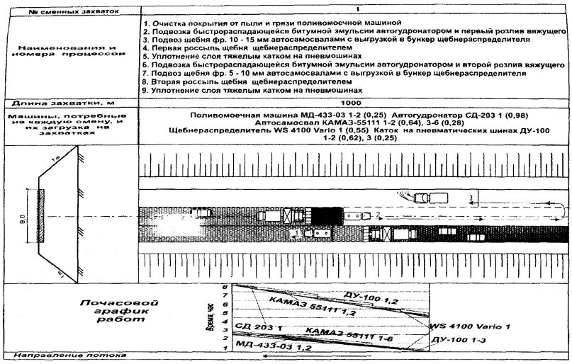 Рис. 1. Технологический план потока по устройству двойной поверхностной обработки с использованием быстрораспадающихся катионных битумных эмульсий 2.5. Розлив эмульсии и распределение щебня производят за два раза в такой последовательности: · розлив эмульсии в количестве 30 % нормы; · россыпь 70 % нормы щебня; · розлив остального количества эмульсии (70 % нормы); · распределение оставшихся от нормы 30 % щебня; · укатка слоя двойной поверхностной обработки. 2.5.1. В зависимости от ширины покрытия, а также технических характеристик автогудронатора и распределителя щебня определяют число и ширину устраиваемых полос. В данном конкретном случае при ширине проезжей части 7,5 м с учетом двух краевых полос по 0,75 м при общей ширине покрытия 9 м целесообразно устраивать 3 полосы по 3 м, что соответствует ширине распределения материала щебнераспределителем WS 4100 Vario. 2.5.2. Розлив битумной эмульсии выполняют авто гудронатором ДС-142Б. Расход вяжущего на 1 м2 обрабатываемой поверхности должен соответствовать нормам, установленным СНиП 3.06.03-85 «Автомобильные дороги». Нормативный расход битумной эмульсии обеспечивает заполнение остаточным вяжущим межщебеночного пространства на высоту, обеспечивающую надежное сцепление с покрытием и исключающую выпотевание битума в период высоких летних температур. 2.5.3. При составлении почасовых графиков следует учитывать, что, в силу различной производительности автогудронатора и щебнераспределителя, часто имеет место недопустимо длительный интервал между операциями по распределению вяжущего и щебня. В данном конкретном случае (рис. 1) на захватке длиной 1000 м время работы щебнераспределителя составляет 2,32 ч, автогудронатора СД-203 - 1,76 ч. Интервал между этими операциями в конце захватки составит 0,56 ч, что недопустимо, поскольку за такой промежуток времени процесс распада битумной эмульсии может завершиться полностью или частично. Во избежание этого необходимо предусматривать остановки автогудронатора через каждые 200 м на 0,11 ч (~ 7 мин), которые целесообразно совмещать с вынужденными остановками для загрузки щебнераспределителя. 2.5.4. Автогудронатор устанавливают в рабочее положение в 2 - 3 м от границы обрабатываемого участка. Такой задел необходим, так как при наборе скорости автогудронатора, равно как и при торможении, нарушается норма распределения вяжущего. Для обеспечения качества устраиваемого слоя этот участок подхода к границе производства работ, так же как и аналогичный, перед остановкой автогудронатора следует закрыть защитным слоем: толем, плотной бумагой. Начальную и конечную границу участка розлива намечают сигнальными флажками, устанавливаемыми на обочине. В конце участка розлива при прохождении первого (предупредительного) флажка готовятся к перекрытию кранов, а у второго флажка на конечной границе быстро их перекрывают и останавливают автогудронатор. После окончания розлива защитные материалы убирают. На участках с продольным уклоном во избежание растекания вяжущего розлив производят при движении автогудронатора на подъем. Закончив розлив на одной полосе, автогудронатор возвращают к началу захватки и разливают вяжущее на второй, следя за тем, чтобы на стыке полос не было излишков битумной эмульсии или пропусков. Для этого по оси каждой из устраиваемых полос обозначают ориентиры для во