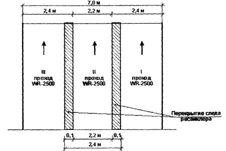 Рис. 2. Технологический план потока по устройству слоя основания (покрытия) из плотных смесей Грунт уплотняют за 8 - 10 проходов катка по одному следу. Первые проходы начинают от кромки проезжей части, затем последующими проходами, смещаясь за каждый проход на 1/3 ширины катка, уплотняют обочины, не доходя 0,3 - 0,5 м до откоса. После этого уплотнение грунта обочины продолжают с перемещением от бровки земляного полотна к проезжей части. При первых двух - трех проходах катка скорость движения составляет 2 - 3 км/ч, при последующих проходах скорость увеличивают до 5 км/ч. Уплотнение грунта заканчивают, когда достигают заданного коэффициента уплотнения 0,98 - 1. Обочины должны быть уплотнены до требуемого коэффициента уплотнения, а также должны иметь ровную поверхность. Поперечный уклон обочин должен обеспечивать сток воды. 2.5. Уплотнение щебеночного (гравийного) основания (покрытия) выполняют в три периода. В первом периоде делают подкатку щебеночной (гравийной) смеси легкими гладковальцовыми катками массой 5 - 6 т за 5 - 6 проходов по одному следу. Скорость движения катков должна быть минимальной - 1,5 - 2 км/ч. Подкатку начинают от краев основания с постепенным перемещением проходов к середине и перекрытием следов на 1/3 ширины вальца катка. После первых проходов катка, в случае необходимости, дорожные рабочие добавляют и разравнивают щебеночную смесь в местах просадок. Во втором периоде щебеночную смесь уплотняют тяжелыми катками на пневматических шинах ориентировочно за 15 - 25 проходов по одному следу. Необходимое число проходов катка по одному следу определяют пробной укаткой. Первые проходы делают по краям основания, последующие - постепенным смещением к середине основания и перекрытием предыдущего следа на 30 - 50 см. Скорость движения катков при первых проходах - минимальная. При последующих проходах скорость повышают до возможной паспортной рабочей скорости. Давление воздуха в шинах 0,6 - 0,8 МПа в зависимости от класса прочности щебня. В сухую и жаркую погоду щебеночную смесь перед уплотнением и в процессе уплотнения поливают водой из поливомоечной машины. Необходимую норму розлива устанавливает представитель лаборатории. В местах просадок дорожные рабочие граблями или киркой разрыхляют верхний слой основания, добавляют щебеночную смесь, планируют ее под рейку и оставляют под дальнейшую укатку. Признаком достаточного уплотнения основания является отсутствие следа от прохода катка; щебенка, брошенная под валец катка, должна раздавливаться. Контроль плотности в полевых условиях выполняют методом лунки. В тех случаях, когда отсутствует каток на пневматических шинах, щебеночную смесь уплотняют вальцовыми самоходными катками в такой последовательности: · в первом периоде уплотняют щебеночную смесь легкими (массой 6 т) или средними (массой 8 т) катками за 8 - 15 проходов катка по одному следу при скорости движения 1,5 - 2 км/ч; · во втором периоде щебеночную смесь уплотняют тяжелыми вальцовыми катками (массой 11 т и более) за 10 - 20 проходов катка по одному следу. Скорость движения катков на первых проходах 1,5 - 2 км/ч, при последующих проходах скорость повышают до паспортной. В первом и втором периодах укатку ведут от краев с постепенным смещением проходов к середине основания и перекрытием предыдущего следа на 1/3 ширины вальца катка. Если на поверх