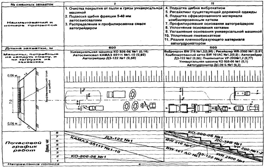 Рис. 1. Технологический план потока по устройству цементобетонного покрытия (шириной 7,5 м и толщиной 0,2 м) с использованием комплекта машин ДС-110 3. БЕЗОПАСНОСТЬ ТРУДА При работе бетоноукладочных машин необходимо соблюдать следующие требования: машины комплекта для скоростного строительства ДС-110 транспортируются на специальных прицепах. При запуске машин необходимо соблюдать правила очередности включения трансмиссии и агрегатов. При совместной работе бетоноукладочной и бетоноотделочной машин расстояние между ними должно быть не менее 10 м. До остановки машин запрещается находиться между ними. Во время работ машин запрещается становиться на вибробрус и отделочный брус. Необходимо, чтобы на верхней площадке вибробруса (вибродоски) не было бетонной смеси и посторонних предметов. Выгружать бетонную смесь в бункер распределителя можно только после установки автомобиля-самосвала на ручной тормоз и подачи сигнала. Запрещается очищать стенки бункера во время его перемещения и движения машины. При нарезке швов в затвердевшем бетоне машинист должен выполнять операции в защитных очках и при исправном защитном кожухе режущих дисков. Запрещается регулировать машину в процессе нарезки шва (при вращающихся дисках) и работать при зафиксированном положении диска. При работе заливщика швов необходимо постоянно следить за состоянием предохранительных клапанов в системе подачи сжатого воздуха. Запрещается снимать крышку с заливщика швов при наличии давления воздуха в емкости, а также регулировать узлы смесительного агрегата или компрессора при работающем двигателе. При производстве работ по устройству цементобетонного покрытия руководствоваться следующей технической литературой: 1. СНиП III-4-80. Техника безопасности в строительстве. 2. СНиП 12-03-2001. Безопасность труда в строительстве. Часть 1. Общие требования. 3. Спельман Е.П. Техника безопасности при эксплуатации строительных машин и средств малой механизации. - М.: Стройиздат, 1986. - 271 с.: ил. Технологическая карта № 17УСТРОЙСТВО ОДИНОЧНОЙ ПОВЕРХНОСТНОЙ ОБРАБОТКИ НА ВЯЗКИХ БИТУМАХ1. ОБЛАСТЬ ПРИМЕНЕНИЯ Технологическая карта разработана на основе методов научной организации труда и предназначена для использования при разработке проектов производства работ и организации труда на строительном объекте. Технологическая карта составлена на устройство одиночной поверхностной обработки на вязких битумах традиционным способом, т.е. при раздельном распределении вяжущего и щебня. Следует учитывать, что более высокое качество поверхностной обработки достигается при синхронном распределении материалов машинами типа «Чипсилер». Однако ограниченное распространение этих механизмов в дорожно-строительных организациях делает весьма актуальным традиционный способ устройства поверхностной обработки. Поверхностная обработка - это способ создания шероховатой поверхности покрытия. Она также восстанавливает слой износа и является защитным слоем и, тем самым, продлевает срок службы дорожных покрытий. При одиночной поверхностной обработке на очищенное от пыли и грязи покрытие разливают органическое вяжущее с последующим распределением черного щебня определенных фракций и его укаткой. Необработанный щебень допускается применять на дорогах с интенсивностью движения менее 1000 авт./сут.