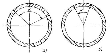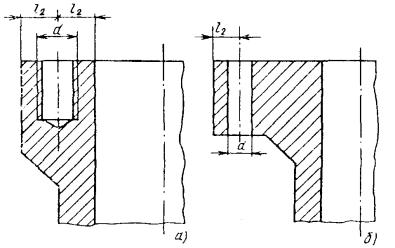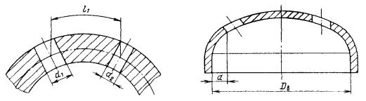 2.2.2.5. Крышки люков, для подъема которых требуется прикладывать усилие более 196 Н (20 кгс), должны иметь приспособления, облегчающие их открытие или позволяющие применять грузоподъемные механизмы. 2.2.2.6. Конструкция шарнирно-откидных и вставных болтов, хомутов, а также зажимных приспособлений люков, крышек и фланцев должна обеспечивать их фиксацию в заданном положении (предохранять от сдвига). 2.2.3. Расстояния между отверстиями 2.2.3.1. Минимальное расстояние по срединной линии между центрами двух соседних отверстий не должно быть менее 1,4 полусуммы диаметров этих отверстий (рис. 3). Контроль указанного расстояния допускается проводить путем измерения расстояний по наружной и внутренней поверхностям с последующим пересчетом. 2.2.3.2. Расстояние по внутренней поверхности от кромки отверстия в сферических, эллиптических, торо-сферических и тарельчатых крышках и днищах до их цилиндрической части, измеренное по проекции, должно быть не менее 0,1 внутреннего диаметра цилиндрической части (рис. 4). 2.2.3.3. Расстояние между центром отверстия под болт или шпильку во фланцах, крышках или нажимных кольцах и их кромкой (внутренней или наружной) должно быть не менее 0,85 диаметра отверстия (рис. 5). Указанное требование не распространяется на фланцы с откидными болтами. 2.2.3.4. В случае технической необходимости, определяемой конструкторской (проектной) организацией, допускаются отступления от требований п. 2.2.1 - 2.2.3 при условии выполнения расчета на прочность в полном объеме, требуемом "Нормами расчета на прочность", или проведения соответствующих экспериментальных исследований. Рис. 5. Расположение отверстий под шпильки (а) и болты (б) (l2 ≥ 0,85d) 2.2.4. Разъемные соединения С целью повышения сопротивления циклической повреждаемости крепежных деталей рекомендуется использовать положения, изложенные в Приложении 14. 2.3. Трубопроводы2.3.3. Средний радиус кривизны колен (гнутых отводов) трубопроводов должен составлять: 1) при изготовлении методом холодной гибки - не менее 3,5 номинального наружного диаметра колена (нормально изогнутые колена); 2) при изготовлении методами горячего деформирования с применением гибки, протяжки, штамповки, осадки, а также для штампо-сварных колен - не менее номинального наружного диаметра колена (крутоизогнутые колена, если средний радиус их кривизны менее 3,5 номинального наружного диаметра колена). Рис.