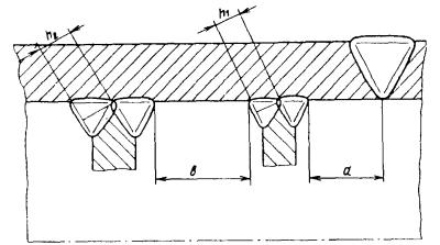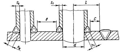 Рис. 13. Расположение сварных швов приварки патрубков: C ³ 3h; C ³ 3S1; l ³ 0,9d; b ³ 3h2; b ³ 3S2 (S2 > S1, h2 > h1) 2) предел текучести металла шва стыкового сварного соединения при расчетной температуре должен быть не ниже предела текучести основного металла (пределы текучести принимаются по стандартам или техническим условиям на материалы и (или) таблицам Норм расчета на прочность и ПК; при отсутствии таких сведений в указанной документации допускается использовать сертификатные данные); это требование не является обязательным в случае приварки патрубков (штуцеров) и труб без развальцовки, если напряжения в стыковом сварном соединении оборудования или трубопровода не превышают пределы текучести металла шва и основного металла при расчетной температуре; 3) внутренняя поверхность отверстий должна быть подвергнута капиллярному или магнитопорошковому контролю. Указанные требования должны быть оговорены в конструкторской документации на изделие. 2.4.3.6. Расстояние между осями соседних поперечных стыковых сварных швов на цилиндрических и конических изделиях должно быть не менее трехкратной номинальной толщины стенки сваренных деталей (по большей толщине), но не менее 100 мм для изделий, имеющих в зоне сварных соединений номинальный наружный диаметр свыше 100 мм, и не менее указанного диаметра при его значении до 100 мм включительно. Указанное требование не распространяется на сварные швы приварки трубопроводов к патрубкам оборудования и арматуры, если указанные патрубки подвергались термической обработке в составе оборудования и арматуры, а также на сварные швы приварки трубных досок и элементов типа колец, имеющих толщину более, чем в два раза превышающую толщину отбортовки под сварку. 2.4.3.7. Расстояние от края сварного шва штуцера до края ближайшего поперечного сварного шва трубы при приварке штуцеров к камерам измерительных диафрагм должно быть одновременно не менее трех толщин стенки привариваемого штуцера и трехкратной расчетной высоты углового шва. Допускается размещение штуцеров с наружным диаметром до 30 мм в зоне термического влияния кольцевых швов измерительных устройств с соплами и диафрагмами. 2.4.3.8. Расстояние в между краями ближайших угловых швов приварки патрубков (штуцеров) или труб к оборудованию или трубопроводам должно быть не менее трех расчетных высот углового шва или трех номинальных толщин стенок привариваемых патрубков или труб (см. рис. 13). При различных значениях указанных высот или толщин следует принимать их большее значение. Требования настоящего пункта не распространяются на вварку труб в трубные доски (решетки) и коллекторы, трубные доски технологических каналов, каналов СУЗ и других каналов. 2.4.3.9. При приварке не нагружаемых давлением плоских деталей к поверхностям оборудования и трубопроводов расстояние между краем углового шва приварки этих деталей и краем ближайшего стыкового шва оборудования или трубопровода а, а также между краями угловых швов ближайших привариваемых деталей в должно быть не менее трех расчетных высот угловых швов (рис. 14). Рис. 14. Расположение сварных швов приварки деталей к поверхностям оборудования и трубопроводов Расстояние в определяется по наибольшей расчетной высоте углового шва (при различных ее значениях). При приварке внутрикорпусных (внекорпусных) деталей и устройст