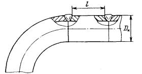 где L - длина свободного прямого участка; DИ - номинальный наружный диаметр соединяемых деталей; SИ - номинальная толщина соединяемых деталей. При этом длина указанных участков должна быть не менее номинального наружного диаметра сваренных деталей при его значениях до 100 мм включительно и не менее 100 мм при значениях диаметра более 100 мм. Примечание. Свободным прямым участком считается участок (с наклоном не более 15°) от оси шва до края ближайшей приварной детали, начала гиба, края соседнего поперечного сварного шва и т.д. 2.4.3.12. В подлежащих ультразвуковому контролю стыковых сварных соединениях длина свободного прямого участка в каждую сторону от оси шва должна быть не менее указанной в табл. 2. 2.4.3.13. Расстояние от края стыкового сварного шва до начала криволинейного участка гиба па трубопроводах с номинальным наружным диаметром 100 мм и более должно быть не менее 100 мм, а для трубопроводов с номинальным наружным диаметром до 100 мм - не менее номинального наружного диаметра трубы (рис. 16). Для штампованных, кованых и штампосварных колен (отводов), гнутых труб поверхностей теплообмена и крутоизогнутых колен допускается уменьшение прямого участка колена (отвода), а также расположение поперечного сварного шва на границе прямого и криволинейного участков. 2.4.3.14. При приварке к оборудованию или трубопроводам деталей (сборочных единиц), прямые участки которых имеют ограниченную длину или отсутствуют (тройники, арматура, крутоизогнутые колена, штампованные и штампосварные переходы и т.п.), требования п. 2.4.3.1-2.4.3.13 не являются обязательными при условии обеспечения возможности проведения местной термической обработки или (и) ультразвукового контроля сварных соединений. При этом возможность выполнения указанного условия должна быть подтверждена предприятием-изготовителем (монтажной организацией) в процессе разработки чертежей изделий конструкторской организацией. Рис. 16. Расположение сварных швов при приварке колена к трубе (при DH > 100 мм l ³ 100 мм; при DH £ 100 мм l ³ DH