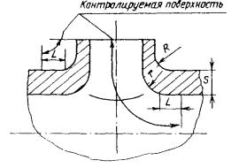где Dmax и Dmin - наибольший и наименьший наружные диаметры изделия, измеренные в одном поперечном сечении. 4.3.2. Отклонение наружного диаметра и овальность конических изделий должны удовлетворять требованиям конструкторской документации. 4.3.3. Отклонение наружного диаметра и овальность цилиндрических изделий, изготавливаемых из труб без дополнительной обработки, связанной с изменением диаметра, должны удовлетворять требованиям стандартов или технических условий на применяемые трубы за исключением прямых участков, примыкающих к гибам на длине, равной двум номинальным наружным диаметрам трубы. На указанных участках, а также на деталях (сборочных единицах), изготавливаемых из труб с дополнительной обработкой, связанной с изменением диаметра, отклонения наружного диаметра и овальность должны удовлетворять требованиям конструкторской документации. 4.3.4. Отклонение внутреннего диаметра сферических днищ и крышек должно быть не более 1% его номинального значения, но не более 20 мм, если технической документацией на изделие не установлены меньшие значения. 4.3.5. Отклонения от заданного чертежом профиля эллиптических и других выпуклых (вогнутых) днищ и крышек (кроме сферических) должны быть не более 1 % номинального значения внутреннего диаметра днища (крышки), но не более 20 мм, если технической документацией на изделие не установлены меньшие значения. 4.3.6. В высаженных горловинах радиус галтели на наружной поверхности горловины R должен быть не менее номинальной толщины стенки детали в месте высадки горловины S, но не менее 20 мм (рис. 18). Допускается уменьшение значения R до 0,25S при значениях S свыше 20 мм и до 5 мм при значениях S до 20 мм включительно при условии, что после высадки горловины деталь подвергают термической обработке (для деталей из сталей аустенитного класса и из углеродистых и кремнемарганцовистых сталей перлитного класса допускается совмещение операций горячей высадки горловины и термической обработки), а после ее выполнения проводят капиллярный или магнитопорошковый контроль наружной и внутренней поверхностей горловины в пределах зоны, указанной на рис. 18. При номинальном внутреннем диаметре высаженной горловины менее 200 мм указанный контроль ее внутренней поверхности может не проводиться по совместному решению конструкторской и головной материаловедческой организаций. Капиллярный и магнитопорошковый контроль следует проводить после механической обработки горловины (в случае выполнения такой обработки). Приведенные требования к радиусам галтелей должны быть выдержаны как до, так и после механической обработки горловин. Рис. 18. Схема высаженной горловины (L = 30 мм) 4.3.7. Овальность гнутых участков труб (определяемая по формуле п. 4.3.1) не должна превышать 6 % на деталях трубопроводов (коленах, отводах и др.) группы А, 8 % на деталях трубопроводов группы В и 12 % на деталях трубопроводов группы С, если меньшие значения овальности не установлены технической документацией на изделие. Для гнутых участков труб на деталях трубопроводов групп В и С допускаются более высокие значения овальности при условии выполнения расчета на прочность, подтверждающего допустимость соответствующей овальности. Расчет должен быть согласован с организацией, определяемой Госатомнадзором России в каждом конкретном случае. Овальность гнут