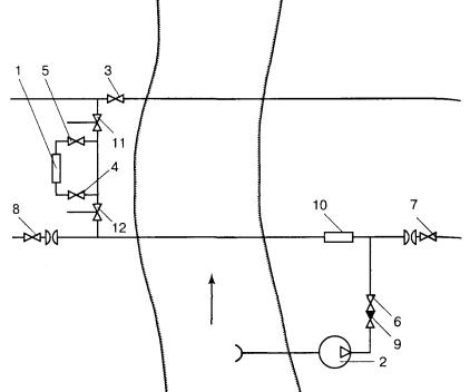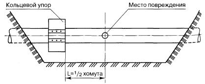 Допустимая толщина монолитного льда при перемещении по нему людей и транспорта. 5.4.17 Засыпается ремонтный котлован под водой методом рефулирования. Для уменьшения уноса грунта на несудоходных реках небольшой глубины применяют систему направляющих, состоящих из отдельных секций, подвешенных друг к другу. Грунт подается с берега через приемный бункер, работающий по принципу эжектирования и транспортировки по пульпопроводу. Бункер загружается с помощью бульдозера или экскаватора. Освобождение аварийного участка ПП МНПП от нефтепродукта и промывка его водой 5.4.18 Работы по опорожнению аварийного участка ПП нефтепродуктопровода от продукта и промывка его водой необходимо выполнять в следующей последовательности: - закрыть береговые задвижки, отсекающие аварийный участок; - врезать вантузы и подготовить обвязку для откачки нефтепродукта в резинотканевый резервуар или закачки его в параллельный трубопровод, закачки воды (воздуха); - подготовить котлован или емкость для сбора нефтепродукта; - подсоединить необходимые механизмы и оборудование; - вытеснить нефтепродукт из трубопровода в параллельный трубопровод или котлован путем принудительной подачи воды (воздуха) в аварийный участок (или иным способом). Одна из возможных схем вытеснения нефтепродукта в параллельный трубопровод представлена на рисунке 1. 5.4.19 В зависимости от характера аварии и от местных условий для сбора вытесненного нефтепродукта и водоэмульсионной нефтепродуктопроводной смеси могут использоваться следующие емкости и сооружения: - резервуарные парки близлежащих перекачивающих станций; - неповрежденные участки аварийного трубопровода или параллельно проложенные трубопроводы; - земляные амбары, котлованы, обвалования или ямы-накопители; - мягкие резинотканевые резервуары или другие емкости. Вытесненный из аварийного участка нефтепродукт заменяется водой. 5.4.20 Решение о виде ремонта аварийного участка принимается в зависимости от вида дефекта и конструктивной особенности ПП МНПП, степени его загрузки. 5.4.21 Перед проведением работ по герметизации необходимо уравновесить внутреннее гидростатическое давление, т.к. избыточное давление способствует образованию зоны нарушения адгезионной связи (при ремонте клеевыми композициями). 5.4.22 В зависимости от характера повреждения трубы применяются методы герметизации, представленные в таблице 6. Рисунок 1. Схема опорожнения аварийного участка со сбросом вытесненного нефтепродукта в параллельный трубопровод: 1 - передвижной насосный агрегат; 2 - насос; 3-8 - отключающие задвижки; 9 - обратный клапан; 10 - поролоновый разделитель; 11-12 - вантуз Схема расстановки машин и механизмов при герметизации поврежденного участка трубопровода представлена на рисунке 2. 5.4.23 Работы по герметизации дефектов с применением клеевых композиций включают следующие этапы: - разметка ремонтируемого участка и очистка от старого покрытия; - установка кондуктора, обеспечивающего точное размещение заплаты и элементов крепления (рисунок 3); - подгонка заплаты по всему профилю дефектного участка (зазор не более 0,5 мм, а длина нахлеста не менее 50 мм); - покрытие заплаты и ремонтируемого участка слоем клея; - накладывание заплаты на дефектное место с небольшими возвратно-поступательными движениями в разные направления; - фиксация заплаты 4-8 