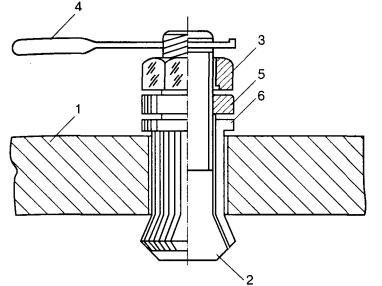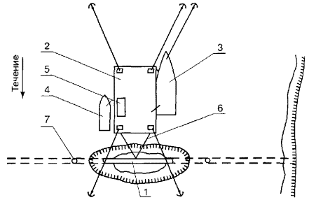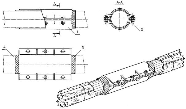 5.4.24 Аварийный ремонт подводного трубопровода с заменой дефектного участка может выполняться: - с использованием конструкции «труба в трубе»; - с заменой дефектного участка: - с подъемом участка ПП над поверхностью воды (льда); - с применением кессонов (полукессонов). Рисунок 2. Схема расстановки машин и механизмов при герметизации поврежденного участка трубопровода: 1 - ремонтируемый трубопровод; 2 - плавучая площадка; 3 - водолазный бот; 4 - шлюпка; 5 - передвижная насосная установка; 6 - грузоподъемное устройство; 7 - буй Рисунок 3. Установка кондуктора Рисунок 4. Конструкция заглушки для герметизации свищей в трубопроводе: 1 - стенка трубы; 2 - болт с конической головкой; 3 - гайка; 4 - держатель; 5 - шайба; 6 - уплотняющая втулка 5.4.25 Замена поврежденных участков под водой осуществляется с помощью кессона, с двумя вариантами входа и выхода: через шахтный колодец (сухой способ); со дна (мокрый способ). Кессоны рассчитаны для работы на глубинах до 10 м, если водолазы спускаются с поверхности воды, и до 30 м - при их входе в кессон со дна. Для работы с кессонами необходимо оборудование, обеспечивающее их функции. 5.4.26 Для выполнения ремонта поврежденного трубопровода с применением кессонов комплектуется водолазная станция. Кроме основного состава, в состав водолазной станции назначается дополнительный персонал для проведения сварочных работ, монтажа и демонтажа кессона, подачи новой катушки и выполнения других подсобных работ. Рисунок 5. Зажим разъемный: 1 - корпус зажима; 2 - болт; 3 - уплотняющая прокладка; 4 - ремонтируемый трубопровод Рисунок 6. Муфта заливочная: 1 - манжетка; 2 - обечайка; 3, 4 - отверстия для выхода воды и заливки компаунда; 5 - хомут Порядок пуска нефтепродуктопровода после ликвидации аварии После завершения всех аварийно-восстановительных работ, при положительных результатах качества выполненных работ руководитель работ по ликвидации аварии организует: - доставку групп для открытия задвижек; - сообщение телефонограммой диспетчеру ПО об окончании работ и готовности трубопровода к возобновлению перекачки; - открытие береговых задвижек по указанию диспетчера ПО, проверку герметичности отремонтированного участка статическим давлением; - проверку на герметичность и прочность отремонтированного участка и технологических соединений после вывода нефтепродуктопровода на режим перекачки. При удовлетворительном состоянии участка в дальнейшем выполняется: - очистка и изоляция мест присоединения отремонтированного участка к нефтепродуктопроводу; - засыпка ремонтного котлована; - установка на вантузах заглушек, установки щитов с запрещающими знаками по ГОСТ 26600-85. 5.5 Локализация и сбор разлившегося нефтепродукта 5.5.1 Работы по локализации разливов нефтепродукта на акватории рек и водоемов включают следующие операции: - ограничение движения пятна нефтепродукта к береговым зонам базирования народнохозяйственных объектов, населенных пунктов, водозаборов и т.д.; - локализацию разлива нефтепродукта; - сбор разлившегося нефтепродукта. 5.5.2 Ограничение направления движения и локализация пятна нефтепродукта производятся установкой плавучих боновых заграждений. 5.5.3 Установка боновых заграждений при локализации разливов нефтепродукта должна производиться в соответствии с инструкцией, разработанной изготовителем данного типа боновых заг