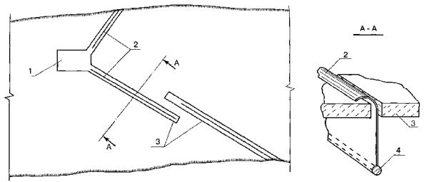 Примечание: В числителе - технические характеристики разработчиков, в знаменателе - результаты лабораторных испытаний. Стоимость договорная. 5.5.18 В особых случаях, когда применение нефтесборщиков и сорбентов невозможно, разлитый продукт, по согласованию с органами пожарной охраны и местными природоохранными органами сжигается. Это происходит в основном в местах скопления нефтепродукта перед металлическими боновыми заграждениями и там, где горение нефтепродукта не представляет опасности для близлежащих объектов. Особенности локализации и сбора пролитого нефтепродукта на водных объектах в зимнее время при наличии ледового покрова 5.5.19 Локализация пятна нефтепродукта и направление его в зону сбора при наличии ледового покрова производится с помощью создания во льду направляющих прорезей. 5.5.20 Прорези располагаются под углом к течению реки в зависимости от скорости течения (в соответствии с рекомендуемыми углами установки БЗ). В конце направляющей прорези устраивается майна для размещения нефтесборщика и вспомогательного оборудования. Для направления нефтепродукта к месту сбора устанавливается заграждение в виде непрерывного полотна из листовых материалов с вмораживаемой верхней кромкой, опускаемого под лед на глубину 0,5-0,7 м. Схема локализации и направления пятна нефтепродукта к месту сбора в зимних условиях представлена на рисунке 10. 5.5.21 Ширина прорези выбирается с учетом всплытия частиц нефтепродукта и зависит от скорости течения и толщины льда. Для сооружения майн и прорезей при небольших толщинах ледового покрова рекомендуется использовать цепные бензопилы (электро) «Дружба». При толщине льда от 0,25 до 1,1 м рекомендуется применять ледорезную несамоходную фрезерную машину ЛФМ. При толщине льда более 1,0 м применяется двухбаровая машина БР-000-00. 5.5.22 Ледорезные работы при глубине воды более 0,5 м допускается выполнять после определения приведенной толщины ледяного покрова и его способности выдержать нагрузку (работающей техники). При измерении толщины ледяного покрова в расчет берется только прочный лед, а слой снежного и пористого пропитанного водой льда не учитывается. При расчете нагрузки на лед следует учитывать, что прочность льда весной уменьшается вдвое. Рисунок 10. Схема локализации и направления пятна нефтепродукта в зимних условиях: 1 - майна; 2 - полотно заграждения; 3 - прорезь; 4 - утяжеляющий груз Измерение толщины льда в местах передвижения людей и техники производится: · зимой - один раз в десять дней, на быстром течении реки - один раз в неделю; · осенью, весной - ежедневно. 5.5.23 Для предохранения прорези и майн от промерзания необходимо применять меры по утеплению. Для утепления могут создаваться каркасные укрытия парникового типа с подачей вовнутрь тепла. При этом необходимо обеспечивать контроль изменения толщины льда с целью обеспечения безопасности работающего персонала. Кроме мер по утеплению для предохранения майн от промерзания могут применяться другие методы. 5.5.24 Технологическая последовательность ледорезных работ заключается в: - очистке льда от снега; - разбивке створа и установке вешек на льду; - установке ледорезной машины в створе; - резке льда ледорезной машиной; - извлечении карт льда (участки ледового покрытия водоема (реки), вырезанные в процессе сооружения майны) из майны; - удале