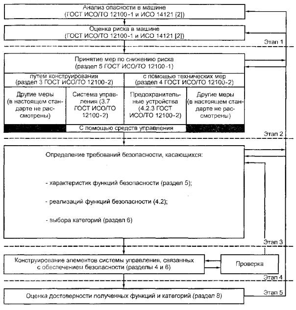 Установить, каким образом будут удовлетворяться эти функции безопасности, и выбрать категорию(и) для каждого элемента или сочетания элементов, относящихся к системе управления, которые связаны с обеспечением безопасности (см. раздел 6). 4.3.5 Этап 4. Конструирование Конструирование элементов системы управления, связанных с обеспечением безопасности, в соответствии с техническими условиями, определенными на этапе 3, и общими принципами конструирования согласно 4.2. Перечислить особенности, предусмотренные конструкцией, которые обеспечивают логическое обоснование для принятой(ых) категории(й). Проверка конструкции на каждой стадии в целях гарантии, что элементы, связанные с обеспечением безопасности, выполняют требования предыдущей стадии разработки в контексте заданной(ых) функции(й) безопасности и категории(й). 4.3.6 Этап 5. Оценка достоверности Оценка достоверности полученных функций безопасности и категории(й) по сравнению с техническими условиями этапа 3. При необходимости повторное конструирование (см. раздел 8). Необходимо также оценить элементы системы управления, связанные с обеспечением безопасности, вместе со всей системой управления и как части данной машины. Требования по такой оценке не входят в область применения настоящего стандарта, но должны быть заданы конструктором машины или определены соответствующим стандартом безопасности типа С. В случае использования программируемых электронных устройств при конструировании элементов систем управления, связанных с обеспечением безопасности, необходимы другие подробные методики (см. 8.4.2). Эти методики находятся в стадии рассмотрения (см. также приложение Д). Примечание - В настоящее время трудно установить с какой-либо степенью достоверности (в ситуациях, когда значительная опасность может возникать вследствие неправильной работы систем управления), что можно гарантировать правильное функционирование одноканального программируемого электронного оборудования. До тех пор пока не будет решена эта проблема, не рекомендуется полагаться на правильную работу такого одноканального устройства (согласно 12.3.5 ГОСТ Р МЭК 60204-1). 4.4 Принципы эргономического конструированияВзаимодействие между операторами и элементами систем управления, связанными с обеспечением безопасности, должно проектироваться и устанавливаться так, чтобы никто не подвергался опасности при всех режимах предназначенного использования и возможных случаях неправильного использования машины (см. также ГОСТ ИСО/ТО 12100-2; раздел 10 ГОСТ Р МЭК 60204-1; раздел 2 ГОСТ Р МЭК 60447; ЕН 614-1 [15]; ЕН 894-1 [16]; ЕН 894-2 [17]; ЕН 894-3 [18] и ЕН 1005-3 [19]). Эргономические принципы следует применять так, чтобы машину или систему управления, включая элементы, обеспечивающие безопасность, можно было легко использовать и не провоцировать оператора работать опасным способом. Следует применять требования безопасности для соблюдения эргономических принципов, указанных в 3.6 ГОСТ ИСО/ТО 12100-2. 5 Характеристики функций безопасности5.1 Общие положенияВ настоящем разделе приведен перечень типовых функций безопасности (см. 3.13 ГОСТ ИСО/ТО 12100-1), которые могут быть соблюдены с помощью элементов систем управления, связанных с обеспечением безопасности. Конструктор (или разработчик стандарта типа С) должен выбирать необходимые функции безопасности из