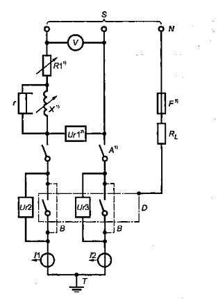 S - источник питания; Ur1, Ur2, Ur3 - датчики напряжения; V - вольтметр; N - нейтраль (искусственная); F - плавкий элемент (8.3.3.5.2g); Z - цепь нагрузки (см. рисунок 8); RL - токоограничивающие сопротивление; D - испытуемый аппарат (с присоединенными проводниками). Примечание - Пунктиром обозначен металлический экран или оболочка; В - перемычки для настройки контура; 11, 12 - датчики тока; Т - точка заземления (на стороне нагрузки или питания). 1) Ur1 могут альтернативно присоединяться между фазой и нейтралью. 2) Если аппарат предназначен для применения в фазно-заземленных системах или если данную схему применяют для испытания нейтрали и смежного с ней полюса четырехполюсного аппарата, F следует присоединять к одной фазе источника питания. В США и Канаде F следует присоединять: - к одной фазе источника питания для аппарата, маркированного единственным значением Ue; - к нейтрали для аппарата, маркированного двойным напряжением (см. примечание к 5.2). Рисунок 4 - Схема испытательной цепи для проверки включающей и отключающей способностей двухполюсного аппарата в однофазной цепи переменного тока (см. 8.3.3.5.2) S - источник питания; Ur1, Ur2, Ur3, Ur4, Ur5, Ur6 - датчики напряжения; V - вольтметр; N - нейтраль (искусственная); В - перемычки для настройки контура; F - плавкий элемент (8.3.3.5.2g); Z - цепь нагрузки (см. рисунок 8); RL - токоограничивающие сопротивление; D - испытуемый аппарат (с присоединенными проводниками). Примечание - Пунктиром обозначен металлический экран или оболочка; 11, 12, 13 - датчики тока; Т - точка заземления (на стороне нагрузки или питания) 1) Url, Ur2, Ur3 могут альтернативно присоединиться между фазой и нейтралью. 2) Если аппарат предназначен для применения в фазно-заземленных системах или если данную схему применяют для испытания нейтрали и смежного с ней полюса четырехполюсного аппарата, F следует присоединять к одной фазе источника питания. В США и Канаде F следует присоединять: - к одной фазе источника питания для аппарата, маркированного единственным значением Ue; - к нейтрали для аппарата, маркированного двойном напряжением (см. примечание к 5.2). Рисунок 5 - Схема испытательной цепи для проверки включающей и отключающей способностей трехполюсного аппарата (см. 8.3.3.5.2) S - источник, питания; Ur1, Ur2, Ur3, Ur4, Ur5, Ur6 - датчики напряжения; V - вольтметр; N - нейтраль (искусственная нейтраль); F - плавкий элемент (8.3.3.5.2g); В - перемычки для настройки контура; Z -цепь нагрузки (см. рисунок 8); RL - токоограничивающие сопротивление; D - испытуемый аппарат (с присоединенными проводниками). Примечание - Пунктиром обозначен металлический экран или оболочка; 11, 12, 13 - датчики тока; Т - точка заземления (на стороне нагрузки или питания) 1) Ur1, Ur2, Ur3 могут альтернативно присоединяться между фазой и нейтралью. Рисунок 6 - Схема испытательной цепи для проверки включающей и отключающей способностей четырехполюсного аппарата (см. 8.3.3.5.2) Рисунок 7 - Схематическая иллюстрация возвращающегося напряжения на контактах первой отключаемой фазы в идеальных условиях (см. 8.3.3.5.2е) S - источник питания; D - испытуемый аппарат; С - переключатель выбора фазы; В - диод; А -регистрирующий прибор; Ra - резистор; G - высоковольтный генератор; R - активные сопротивления цепи нагрузки; X - катушки индуктивности (8.3.3.5.2d); Rp - параллельные активные сопротивления; Ср - параллельные конденсаторы; 11 ,12, 13 - датчики тока. Взаимное расположение высоковольтного генерат