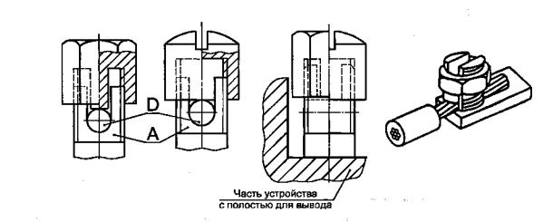 Испытанию подвергают на двух новых образцах: а) максимальное число проводников наименьшего поперечного сечения, присоединяемого к выводу; b) максимальное число проводников наибольшего поперечного сечения, присоединяемого к выводу; c) максимальное число проводников наименьшего и наибольшего поперечных сечений, присоединяемых к выводу. Выводы, предназначенные для присоединения гибких или жестких (одно- и/или многожильных) проводников, следует испытывать с проводниками каждого типа на различных комплектах образцов. Выводы, предназначенные для присоединения и гибких, и жестких (одно- и/или многожильных) проводников одновременно, следует испытывать по подпункту с). Для испытания следует использовать подходящий испытательный аппарат. К выводу следует присоединить установленное число проводников. Длина испытуемых проводников должна на 75 мм превышать высоту Н, указанную в таблице 5. Зажимные винты следует затягивать с приложением крутящего момента по таблице 4 или инструкции изготовителя. Испытуемый аппарат должен быть закреплен согласно рисунку 1. Каждый проводник подвергают круговому движению следующим способом. Конец испытуемого проводника пропускают через соответствующего размера гильзу в пластине, расположенной на высоте Н ниже вывода аппарата согласно таблице 5. Прочие проводники следует согнуть, чтобы они не влияли на результаты испытания. Гильзу следует вставить в горизонтальную пластину концентрично проводнику. Гильзу следует смещать так, чтобы ее центральная линия описывала круг диаметром 75 мм вокруг своего центра в горизонтальной плоскости с частотой (10±2) мин-1. Расстояние между зажимным концом вывода и верхним краем гильзы не должно отличаться от размера по таблице 5 более чем на 13 мм. Во избежание застревания, скручивания или проворачивания изолированного проводника гильзу следует смазывать. К концу проводника следует подвешивать груз, создающий тянущее усилие, указанное в таблице 5. В ходе испытания следует совершить 135 непрерывных вращений. Во время испытания проводник не должен ни выскальзывать из вывода, ни ломаться близ зажима. Немедленно после испытания на изгиб каждый испытуемый проводник должен подвергнуться в аппарате испытанию по 8.2.4.4 (на вытягивание). 8.2.4.4 Испытание на вытягивание 8.2.4.4.1 Круглые медные проводники После испытания по 8.2.4.3 к проводнику следует приложить тянущее усилие, указанное в таблице 5 Перед этим испытанием зажимные винты подтягивать не допускается. Усилие следует прилагать без рывков в течение 1 мин. Во время испытания проводник не должен ни выскальзывать из вывода, ни ломаться вблизи зажима. 8.2.4.4.2 Плоские медные проводники Проводник нужной длины следует закрепить в выводе и в течение 1 мин без рывков приложить тянущее усилие, указанное в таблице 6, в направлении, противоположном вставленного проводника. Во время испытания проводник не должен ни выскальзывать из вывода, ни ломаться вблизи зажима. 8.2.4.5 Испытание на возможность вставления круглых неподготовленных медных проводников с максимальным установленным поперечным сечением 8.2.4.5.1 Методика испытания Испытание должно выполняться с применением щупов формы А или В, характеризуемых в таблице 7. Рабочий элемент щупа должен проникать в отверстие вывода под собственным весом на полную глубину вывода (см. также примечан