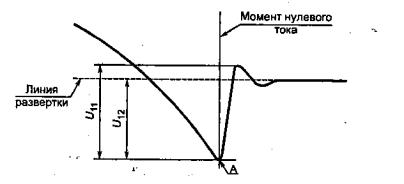 включения и возвращающегося напряжения во время испытания на отключение данного испытуемого аппарата и оцененной согласно рисунку 13 для переменного тока и рисунку 14 - для постоянного тока. Напряжение на входной стороне следует измерять в течение первого полного периода после гашения дуги во всех полюсах и подавления высокочастотных колебаний (см. рисунок 13). Если требуется дополнительная информация, например о напряжении на контактах отдельных полюсов, времени дуги, энергии дугообразования, коммутационном перенапряжении и т. п., ее можно получить с помощью дополнительных датчиков на каждом полюсе, причем сопротивление каждой такой измерительной цепи должно быть не ниже 100 Ом/В действующего значения напряжения на отдельных полюсах; это значение должно быть внесено в протокол испытания. b) Определение ожидаемого тока отключения Это определение осуществляют путем сопоставления типовых характеристик, полученных в период начальной калибровки цепи и во время испытания аппарата на отключение (см. рисунок 13). На переменном токе