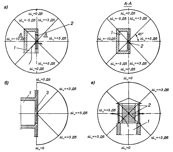 где Lвн i - уровень звукового давления в i-й октавной полосе у наружного ограждения внутри помещения с источниками шума, дБ; Soг - площадь наружного ограждения, м2; S0 = 1 м2; ∆Li - снижение уровня звукового давления при прохождении звука через наружное ограждение, дБ. Рисунок 3.2 - Показатель направленности излучения шума вентиляционных систем при выходе его в атмосферу а - всасывание или выпуск в одну сторону через жалюзи; б - то же, через решетку; в - равномерный выпуск во все стороны через жалюзи; 1 - шахта или канал; 2 - жалюзи; 3 - решетка Значения Lвн i определяют по формуле