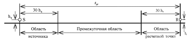 3.3.7 Снижение уровня звукового давления за счет влияния подстилающей поверхности 3.3.7.1 При вычислении поправки ∆Lгр, вызванной подстилающей поверхностью, необходимо вначале классифицировать ее относительно акустических свойств грунта. Расчет возможен только для поверхностей, расположенных под скользящим углом менее 20°, и с небольшими неровностями (рисунок 3.3). Этот случай охватывает большинство задач распространения звука в открытом пространстве. Рисунок 3.3 - Пути распространения звука от источника до приемника над поверхностью Р rsr - прямой луч звука; rr - луч звука, отраженного от плоскости Р Различают следующие покрытия (поверхности): 1. Жесткая поверхность. Это асфальт, бетонное покрытие, вода и другие виды грунтового покрытия, имеющее малую пористость. Например, утрамбованный грунт, встречающийся наиболее часто вблизи промышленных площадок, может рассматриваться как твердое покрытие. 2. Мягкая поверхность. Это земля покрытая травой, с деревьями и другой растительностью, все виды пористого грунта, пригодные для роста растений, и, в частности, пахотная земля. 3. Очень мягкая поверхность. Сюда относятся очень пористые покрытия, такие, как поверхности, покрытые снегом, иголками хвойных деревьев и аналогичными веществами. 4. Смешанное покрытие. Это грунтовые поверхности, которые включают в себя области как с твердым, так и с мягким покрытием. 3.3.7.2 Снижение уровня звукового давления за счет подстилающей поверхности ∆Lгр следует определять следующим образом [3]. Вначале всю область, расположенную между источником и расчетной точкой, необходимо разделить согласно рисунку 3.4 на три части: область источника, область расчетной точки и промежуточная область. При этом каждой из областей приписывается определенное число G, называемое поверхностным фактором. 1. При максимальном расстоянии область источника простирается от источника звука по направлению к расчетной точке на расстояние, равное 30hs, где hs - высота источника звука в метрах. 2. При максимальном расстоянии область расчетной точки простирается наоборот от расчетной точки по направлению к источнику звука на расстояние, равное 30 hr, где hr - высота расчетной точки в метрах. 3. Промежуточная область лежит между областью источника и областью расчетной точки. При условии ssr < 30(hs + hr) область источника и область расчетной точки перекрываются и промежуточной области не существует. Расстояние ssr представляет здесь проекцию расстояния rsr между источником и расчетной точкой на плоскость Р подстилающей поверхности. При этом поверхностный фактор G полагается равным нулю для жесткой поверхности, единице для мягкой поверхности и доле мягкой поверхности в общем балансе для смешанной поверхности. Для очень мягкой поверхности число G не определяется. Рисунок 3.4 - Разделение области между источником звука и расчетной точкой на три части Таблица 3.17 - Коэффициенты As, Аr и Аm