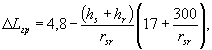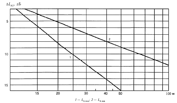 Рисунок 3.14 - Поправка ∆LA5, связанная со снижением уровня звука в зависимости от расстояния от проезжей части улицы до трамвая 3.4.13 Расчетный спектр транспортного шума у наружного ограждения здания определяется по рассчитанному ожидаемому уровню звука в дБА с помощью относительных спектров. Эти значения октавных уровней приведены в таблице 3.27 относительно уровня в дБА. 3.4.14 Поправки ∆LAгр к снижению уровня звукового давления, вызванные подстилающей поверхностью вблизи транспортных магистралей, описываются формулами, приведенными в подразделе 3.3.7. 3.4.15 Снижение уровней звука ∆LАэкр, дБА, экранами бесконечной длины от рельсового и автомобильного транспорта следует определять согласно формуле ∆LАэкр = ∆LАэкр В, (3.70) где ∆LАэкр в - величина, дБА, определяемая по таблице 3.28 в зависимости от разности длин путей прохождения звукового луча d, м, при принятой высоте экрана. Таблица 3.27 - Поправки к относительным спектрам транспортных шумов