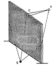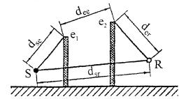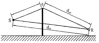 С3 - коэффициент, равный единице для тонких экранов, в случае двойной дифракции равен теперь [3]: dee - расстояние между двумя линиями, на которых происходит двойная дифракция звука. Расстояние dee измеряется в метрах. Рисунок 3.8 - Распространение лучей звука при двукратной дифракции на толстом экране Примечания 1 Выражение (3.48) осуществляет плавный переход в формуле (3.46) от однократной дифракции, когда dее = 0, а С3 = 1, к случаю двукратной дифракции, когда dee = λ, а С3 = 3. 2 Эффективность экрана может оказаться меньше величины, рассчитанной по формулам (3.43) - (3.50). Это возможно в результате многократного переотражения звука между источником и акустически жестким экраном, а также отражения звука от других акустически жестких поверхностей. Эти поверхности могут располагаться недалеко от пути прохождения звука от его источника до расчетной точки. 3 Выражение Dz, рассчитанное в произвольных октавных полосах по формуле (3.46), не должно быть больше 20 дБ для тонких экранов при однократной дифракции. Для толстых экранов и двукратной дифракции соответствующее выражение Dz, рассчитанное по формуле (3.48), не должно быть больше 25 дБ [3]. Ослабление звука с помощью двух экранов рассчитывается с помощью формулы (3.48) для двойной дифракции звука, как показано на рисунке 3.9. Ослабление звука тремя или более экранами рассчитывается приближенно с помощью того же уравнения (3.48) выбором двух наиболее эффективных экранов и пренебрегая действием других экранов. Рисунок 3.9 - Распространение лучей звука при двукратной дифракции на двух экранах 3.3.8.5 Вопросы, связанные с выбором и применением конкретных конструкций экранов и других наружных ограждений, обеспечивающих требуемое экранирование объектов, изложены в приложении В [14]. 3.3.9 Снижение уровня звукового давления вследствие влияния других факторов 3.3.9.1 Снижение уровня звукового давления может происходить и за счет других дополнительных факторов. Отражение звука от окружающих объектов может приводить к образованию дополнительных мнимых источников шума. Зеленые насаждения могут образовывать преграду на пути прямого распространения звука. Снижение уровня звукового давления может происходить и вследствие ограничения угла видимости источника шума из расчетной точки. Отражения должны рассматриваться в качестве мнимых источников звука. Эти отражения от потолков или поверхностей, более или менее вертикальных фасадов зданий, обычно усиливают звук в точке приема. Эффект отражения звука от земной поверхности не должен учитываться, поскольку он включен в общие формулы (3.13), (3.14) в качестве составляющей ∆Lгр. 3.3.9.1.1 Отражения от препятствий рассчитываются согласно приведенной ниже методике при следующих условиях: · зеркальное отражение происходит таким образом, как показано на рисунке 3.10; Рисунок 3.10 - Приход отраженного луча в расчетную точку R из мнимого источника S1. При прохождении расстояния rso + ror прямой луч отражается от плоскости под углом, равным углу падения β · величина коэффициента отражения от поверхности объекта должна быть больше 0,2; · характерные размеры отражающей поверхности должны быть велики по сравнению с длиной волны звука, соответствующей среднегеометрической частоте октавной полосы. При этом должно иметь место следующее неравенство: