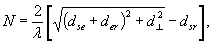 Разность длин путей прохождения звукового луча d, м, в соответствии со схемой экрана, приведенной на рисунке 3.7, следует определять по формуле δ = dse + der - dsr, (3.71) где dse - расстояние, м, от источника звука до точки, лежащей на ребре полубесконечного экрана и на пути, определяемом наикратчайшим расстоянием между источником и расчетной точкой; der - расстояние, м, от расчетной точки до упомянутой выше точки, лежащей на ребре полубесконечного экрана и на пути, определяемом наикратчайшим расстоянием между источником и расчетной точкой; dsr - расстояние, м, от источника звука до расчетной точки. 3.4.16 Снижение уровня звука экраном конечной длины ∆LАэкр, дБА, следует определять по формуле ∆LАэкр = ∆LАэкр α + Λд, (3.72) где ∆LАэкр a - меньшая из величин Λд - поправка, дБА,
