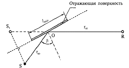 где λ - длина волны звука, м, соответствующая среднегеометрической частоте fcr октавной полосы и связана с этой частотой следующим соотношением: λ = 340/fсг; rso - расстояние, м, от источника звука до точки отражения О; rоr - расстояние, м, от точки отражения О до расчетной точки; β - угол падения в радианах (см. рисунок 3.10); lmin - минимальный размер (длина или ширина) отражающей плоскости (см. рисунок 3.10). При невыполнении одного из перечисленных выше условий для данного октавного диапазона отражения не учитываются. 3.3.9.1.2 При расчете снижения уровня звукового давления действительный и мнимый источники рассматриваются отдельно. Уровень звуковой мощности мнимого источника в октавных диапазонах вычисляется по следующей формуле [3]: LW Im = Lws + 10 lg (ρ) + Ф, (3.52) где LW Im - уровень звуковой мощности мнимого источника звука, дБ; LWs - уровень звуковой мощности действительного источника звука, дБ; ρ - коэффициент отражения звука, падающего под углом β на препятствие (ρ > 0,2); Ф - фактор направленности источника в направлении мнимого изображения расчетной точки (точка S1 на рисунке 3.10). При отражении звука от объектов с жесткими поверхностями, имеющих цилиндрическую форму, коэффициент отражения рассчитывается по формуле