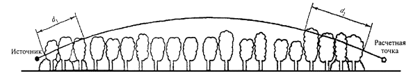 3.3.9.1.3 Приближенная оценка отражения звука от вертикальных поверхностей типа внешних стен зданий может производиться также с помощью формулы, приведенной в 3.3.7.3. Для этих целей необходимо воспользоваться рисунком 3.3 и считать, что отражающая плоскость Р является внешней стеной. Расчет производится на основе вычисления разности длин прямого rrs и отраженного rr лучей. Примечания 1 Для эффективного отражения звука необходимо, чтобы стена в точке отражения была плоской, по крайней мере на расстоянии одной длины волны самой низкой частоты в спектре шума. 2 Поскольку отражение усиливает звук, то знак ∆Lотр должен быть отрицательным. 3 В случае существования нескольких отражающих поверхностей их вклад суммируется. 3.3.9.2 Полосы зеленых насаждений дают существенное снижение уровней звукового давления ∆Lзел только в случаях, когда они являются достаточно плотными. Для этого необходимо, чтобы они образовывали полную преграду на пути прямого распространения звука, т.е. чтобы не были видны отдельные участки пути через растительность. Снижение может определяться участком полосы вблизи источника длиной d1 или участком полосы вблизи расчетной точки длиной d2, или обоими участками длиной d1 и d2, как показано на рисунке 3.12. При вычислении длин d1 и d2 радиус кривой может быть взят равным примерно 5 км. С другой стороны, участки длиной d1 и d2 могут быть взяты вдоль лучей, проходящих под углом 15° к поверхности грунта [3]. Снижение уровня звукового давления ∆Lзел необходимо определять в октавных полосах частот и в зависимости от общей длины df = d1 + d2, м, проходимой звуком через плотную листву участка полосы зеленых насаждений. Снижение ∆Lзел обычными многорядными полосами зеленых насаждений с плотным примыканием крон деревьев между собой и с заполнением полкронового пространства кустарником следует определять согласно следующей формуле и таблице 3.21: Лесная полоса Рисунок 3.12 - Определение расстояния Таблица 3.21 - Постоянная В и коэффициент αзел
