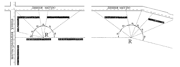 Рисунок 3.13 - Примеры разбивки территории в окрестности линии метро на участки, отличающиеся по условиям распространения шума При выполнении приближенных расчетов можно воспользоваться формулой ∆LА зел = αA зелdf, (3.55) где αА зел = 0,08 - среднее значение постоянной затухания, дБ/м, [13]. Примечания 1 Деревья и кустарники являются плохими барьерами для шума. Затухание звука за счет экранирования ими шума оказывается в общем невелико. Однако их корни приводят к пористости подстилающей поверхности, над которой распространяется звук. Поэтому наибольший эффект в ослаблении звука обеспечивается не в результате экранирующего действия растительности, а за счет увеличения снижения звука подстилающей поверхностью, которое учитывается поправкой ∆Lгр. Однако если листва плотной растительности перекрывает ход звуковых лучей полностью, то возникает дополнительное затухание звука, учитываемое членом ∆Lгр. Лес, полосы насаждений естественной растительности, забор из кустарников - все это может быть примерами плотной растительности. Голые же сучья и голые стволы деревьев ни к какому дополнительному поглощению звука не приводят. 2 Формулы (3.54) и (3.55) можно использовать при ширине полосы зеленых насаждений не более 200 м. Для участка пути df > 200 м принимают ∆Lзел равным значению, соответствующему df = 200 м. Снижение уровня звукового давления полосами зеленых насаждений следует учитывать только при расчете уровней звука на площадках отдыха микрорайонов и групп жилых домов, на площадках детских дошкольных учреждений и на участках школ. 3.3.9.3. Снижение уровня звукового давления ∆Lα (дБ) вследствие ограничения угла видимости улицы или дороги из расчетной точки следует определять по формуле