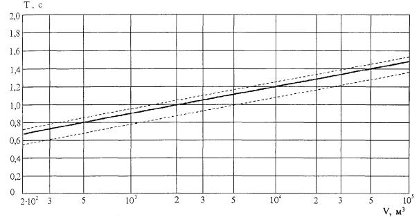 где F - площадь сечения устанавливаемого глушителя, м2. Шумообразование в трубчатых глушителях следует определять по данным для пластинчатых глушителей с обтекателями на входе с эквивалентным периметром звукопоглощающих поверхностей поперечного сечения. Примечание - Для предупреждения выдувания стекловолокнистого материала νдоп не должна превышать 15 м/с. Глушители шума следует устанавливать как можно ближе к вентилятору. 3.5.7 Кожухи для открыто стоящего оборудования, являющегося источником повышенного шума, следует проектировать из листовых несгораемых или трудно сгораемых материалов. Толщину стенок кожуха подбирают исходя из частотной характеристики требуемой изоляции воздушного шума, которую в случае выполнения стенок кожуха с внутренним покрытием из звукопоглощающего материала определяют по формуле Rk тр i = ∆Lтр i + ∆Ri + 5, (3.77) где ∆Lтр i - требуемое снижение уровня звукового давления в i-й октавной полосе частот, дБ, определяемое согласно 3.1.8; ∆Ri - поправка, дБ, вычисляемая по формулам: а) для кожухов со звукопоглощающей облицовкой ∆Ri = 10 lg αобл i, (3.78) где αобл i - реверберационный коэффициент звукопоглощения облицовки в i-й октавной полосе частот; б) для необлицованных кожухов где Sист - площадь воображаемой поверхности правильной формы (полусфера, параллелепипед и т.д.), вплотную окружающей источник, м2; Sк - площадь поверхности кожуха, м2. Примечание - При αобл i < 0,4 в данной октавной полосе кожух можно считать необлицованным и выполнять расчет ∆Ri, по формуле (3.79). Изоляция воздушного шума стенками кожуха Ri должна быть не менее Rk тр i во всем нормируемом диапазоне частот. Частотные характеристики изоляции воздушного шума некоторыми конструкциями представлены в приложении А. Кожухи должны быть герметичными, съемными или разборными с возможностью доступа к важным узлам оборудования (дверцы). Проемы в кожухах с пропускаемыми через них коммуникациями должны быть герметизированы вязкоупругим материалом. При необходимости пропуска через кожух воздуха пропускные отверстия следует снабжать глушителями, обеспечивающими снижение шума не ниже Rk тр i для стенок кожуха. Кожухи следует устанавливать таким образом, чтобы не было соприкосновения с элементами изолируемого оборудования и с элементами конструкций, на которых оно установлено. Для развязки можно использовать виброизолирующие (резиновые) прокладки. 3.5.8 После подбора строительно-акустических мероприятий по снижению шума необходимо выполнить перерасчет ожидаемых суммарных уровней шума во всех расчетных точках от источников на объекте метрополитена с учетом всех предлагаемых шумозащитных мероприятий. В случае положительного значения ∆Lтр в выражениях (3.1), (3.3), (3.5), (3.6) хотя бы для одной из расчетных точек необходимо выявить обусловливающие этот факт причины и устранить их, подобрав соответствующее шумозащитное мероприятие. 4 АКУСТИЧЕСКОЕ ПРОЕКТИРОВАНИЕ СТАНЦИЙ МЕТРОПОЛИТЕНА4.1 Общие положения4.1.1 Настоящий Свод правил представляет методику акустического планирования основных помещений и залов станций в уровне посадочных платформ метрополитенов с использованием архитектурно-строительных и электроакустических средств. Рисунок 4.1 - Рекомендуемое время реверберации на частотах 500 - 2000 Гц для залов станций в уровне посадочных платформ метрополитена 4.1.2 Использован