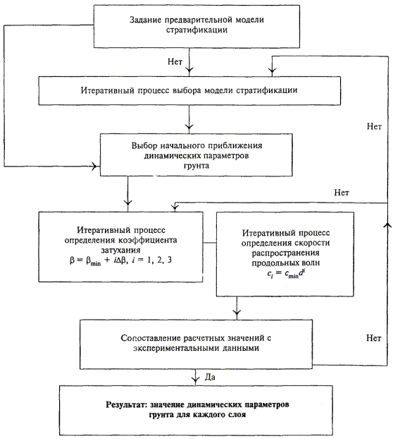 Здесь cmin и cmax - минимальная и максимальная скорости продольных волн для данного типа грунта (см. приложение А). Таким образом, в зависимости от значения сmax / сmin имеем 3, 4 или 5 итераций по скорости продольных волн. Скорость поперечных волн при каждой итерации вычисляется по формуле (4.4) настоящего СП с постоянным коэффициентом Пуассона. При необходимости на каждой итерации варьируется коэффициент затухания. Если на некотором шаге достигается требуемая точность, задача оценки параметров считается решенной. 4.2.8 Если исходные данные по геологическому строению грунта в рассматриваемом районе отсутствуют, тогда из исходных данных исключается информация о стратификации, при этом дополнительными неизвестными параметрами являются число слоев (от 1 до 3) и толщина каждого слоя (общее число дополнительных параметров от 1 до 4). Анализ ведется, начиная с простейшей однослойной модели, если при этом требуемая точность не достигается, осуществляется переход к двух- и трехслойным стратификациям. Выбор толщины каждого слоя осуществляется из учета характера поведения поля вибрации, полученного в эксперименте, на малом и большом расстоянии от источника. Начальными значениями для скорости продольных волн выбирается величина с = 100 м/с, а для коэффициента затухания b = 0,05. 4.2.9 В случае наличия предварительной информации о геологическом строении верхней части грунта дополнительными исходными данными (параметрами) являются: · тип стратификации, т.е. число слоев в верхней части грунта до глубины, определяемой выражением (4.3) с учетом 4.2.1 настоящего Свода правил; ·толщина каждого слоя; ·минимальная и максимальная величина скорости продольных волн для каждого слоя (приложение А); ·минимальная и максимальная величина коэффициента затухания продольных волн для каждого слоя (приложение А). 4.3 Получение исходной экспериментальной информации при определении параметров грунта4.3.1 Средства измерений вибрации должны соответствовать требованиям ГОСТ 12.4.012 и иметь действующее свидетельство о поверке. 4.3.2. Для измерения корректированного значения виброскорости следует применять средства измерений, обеспечивающие частотную коррекцию в вертикальном и горизонтальном направлениях для общей вибрации по ГОСТ 12.1.012. 4.3.3. Для выполнения частотного анализа следует применять аппаратуру, удовлетворяющую требованиям ГОСТ 17168. Рекомендуемый перечень современных цифровых анализаторов приведен в приложении Д. 4.3.4 Допускается предварительная запись сигнала на измерительный магнитофон с последующей обработкой записанной информации. 4.3.5 Использование последовательности расчета 4.2.1 - 4.2.9 (см. рисунок 4.1) настоящего СП основано на результатах измерений величин вибрации на разных расстояниях от стандартного источника на участке, на котором впоследствии предполагается прогнозирование вибрации от действующей, строящейся или проектируемой линии метрополитена. Общая методика получения экспериментальной информации должна включать следующие компоненты: · описание аппаратуры, используемой в процессе измерений; ·описание процедуры измерений; ·описание способа представления полученных результатов; ·описание процедуры обработки результатов. 4.3.6 Стандартизованный источник вибрации на поверхности грунта должен удовлетворять следующим требованиям: · в качестве ис