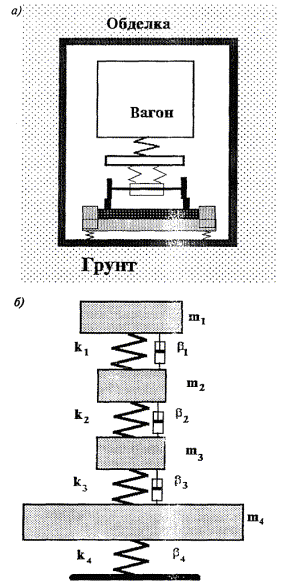 Здесь s - коэффициент Пуассона; rг - плотность грунта; R - радиус обделки; L - длина вагона. В результате следует принимать k4 = 109 Н/м; b4 = 2 × 105 Н×с/м. а - механическая схема; б - физическая модель системы Рисунок 5.3 - Взаимодействующие вязкоупругие элементы в системе «вагон - виброизоляционная конструкция верхнего строения пути» 5.2.4 В расчетах для подвижного состава и обделки выбираются следующие значения определяющих параметров: m1 = 50 т; т2 = 9,9 т; m3 = 55 т (вариант 1) и 13 т (вариант 2); m4 = 50 - 150 т (вариант 1); m4 = 100 - 200 т (вариант 2); k1 = 5,45 × 106 Н/м; k2 = 1,36 × 107 Н/м; Im k1 = 0,05k1; Im k2 = 0,05k2; Im k3 = 0,05k2. 5.2.5 Общая жесткость амортизаторов рассчитывается по формуле