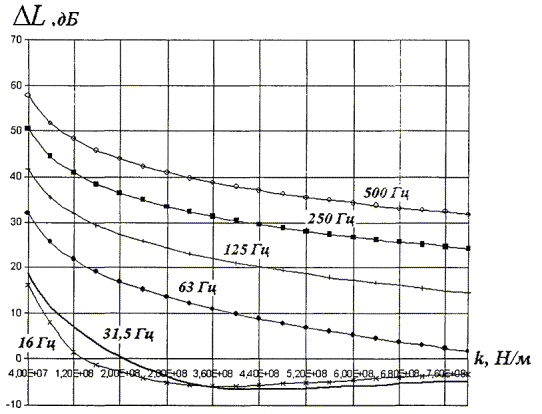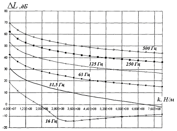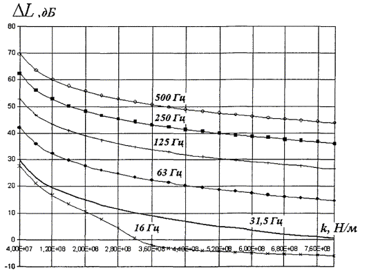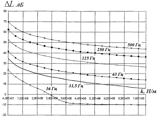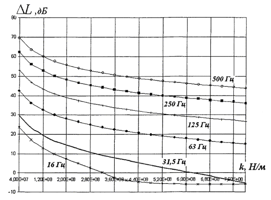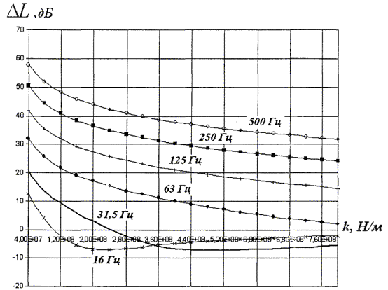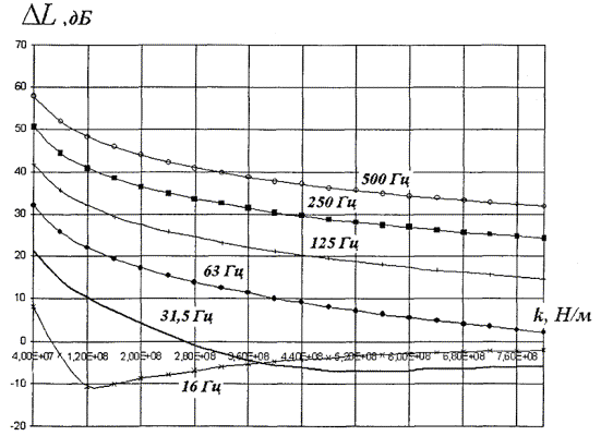 Рисунок 5.8 - Зависимость эффективности виброзащитной конструкции (вариант 2) от жесткости амортизаторов, приведенной к длине вагона, для случая грунтов со скоростью продольных волн 200 - 600 м/с