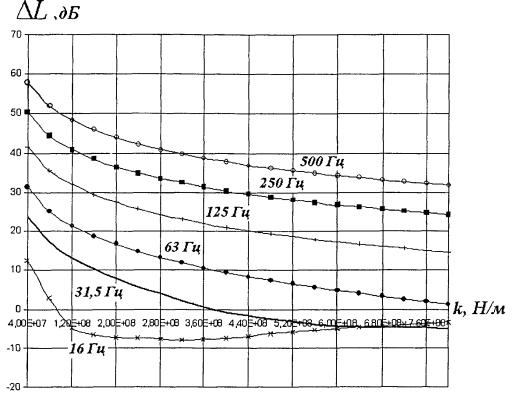 Рисунок 5.7 - Зависимость эффективности виброзащитной конструкции (вариант 1) от жесткости амортизаторов, приведенной к длине вагона, для случая грунтов со скоростью продольных волн более 2000 м/с