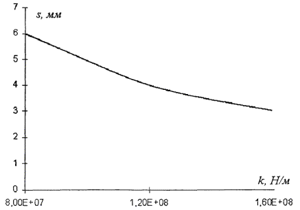 Рисунок 5.10 - Зависимость эффективности виброзащитной конструкции (вариант 2) от жесткости амортизаторов, приведенной к длине вагона, для случая грунтов со скоростью продольных волн 1200 - 2000 м/с Рисунок 5.11 - Зависимость эффективности виброзащитной конструкции (вариант 2) от жесткости амортизаторов, приведенной к длине вагона, для случая грунтов со скоростью продольных волн более 2000 м/с Рисунок 5.12 - Зависимость статической вертикальной просадки верхнего строения пути s от жесткости виброзащитной конструкции k 5.3 Дополнительные мероприятия в верхнем строении пути по снижению возбуждаемой вибрации5.3.1 Установка под щебеночную постель шероховатого трехслойного резинового мата толщиной 3 см приводит к уменьшению уровней вибрации, начиная с частотного диапазона 63 Гц (таблица 5.1). Аналогичный эффект достигается при укладке под щебеночную постель минераловолокнистых плит толщиной 10 см. 5.3.2 Использование вместо балластного корыта с щебеночной засыпкой сплошной плиты толщиной 40 см ведет к повышению эффективности виброизолирующей конструкции. Значения соответствующей дополнительной эффективности приводятся в таблице 5.2. Таблица 5.1 - Эффективность шероховатого трехслойного резинового мата толщиной 3 см, устанавливаемого под щебеночную постель