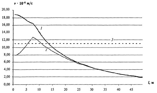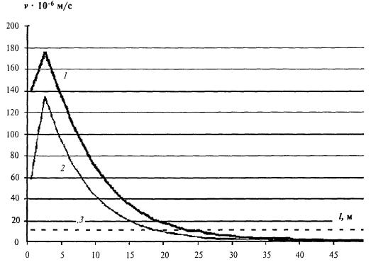 ПРИЛОЖЕНИЕ Б(рекомендуемое) РАСЧЕТ ЗНАЧЕНИЙ ВИБРОСКОРОСТИ НА ПОВЕРХНОСТИ ГРУНТА ВБЛИЗИ ПЕРЕГОННЫХ ТОННЕЛЕЙОпределение величин вибрации поверхности грунта проводится в соответствии с разделами 4, 6 настоящего Свода правил. Необходимо задать следующие исходные данные: · величины виброскорости лотковой части обделки тоннеля, определяемые в октавных полосах (таблица 3.2) или непосредственно с учетом 4.3 настоящего Свода правил; · параметры грунта; · параметры обделки, включая геометрическую форму и размеры, массовые и упругие характеристики материала обделки; · данные о глубине заложения тоннеля и расстояние от оси тоннеля до контрольной точки. Пример расчета Определить амплитуды виброскорости на поверхности грунта, возбуждаемого движением поездов метрополитена в тоннеле с глубиной заложения 12 м от основания лотка до поверхности. Строение пути - типовое (деревянные шпалы, утопленные в бетон). Конструкция обделки тоннеля - цельносекционная железобетонная (приложение Г настоящего Свода правил, рисунок Г.2). Геологическая обстановка - суглинок тугопластичный с плотностью 1700 кг/м3, скоростями распространения продольных и поперечных волн соответственно 600 и 250 м/с и декрементом затухания во всем нормируемом диапазоне частот 0,1. Зависимости максимальных величин вибрации в октавных диапазонах 16, 31,5 и 63 Гц от расстояния до стены тоннеля (в плане) приводятся соответственно на рисунках Б.1 - Б.3. Все расчеты производятся для максимальных значений виброскорости. На тех же рисунках приводятся для сравнения нормативные значения виброскорости для жилых зданий в ночное время суток. Переход к эквивалентным значениям производится по формуле, представленной в 6.4 настоящего Свода правил с учетом реального режима движения поездов на рассматриваемой линии метрополитена. Расчет дает следующие результаты: Удаление 10 м 16 Гц - 1,4 × 10-5 м/с, превышение составляет 2 дБ; 31,5 Гц - 1,2 × 10-4 м/с, превышение составляет 21 дБ; 63 Гц - 6,4 × 10-5 м/с, превышение составляет 15 дБ. Корректированная величина - 3,5 × 10-5 м/с, превышение составляет 9 дБ. Удаление 20 м 16 Гц - 7,3 × 10-6 м/с, превышение отсутствует; 31,5 Гц - 4,9 × 10-5 м/с, превышение составляет 13 дБ; 63 Гц - 1,7 × 10-5 м/с, превышение составляет 4 дБ. Корректированная величина - 1,3 × 10-5 м/с, превышение составляет 2 дБ. Для снижения величин вибрации в частотных октавных диапазонах 16, 31,5 и 63 Гц могут быть использованы плиты жесткости в основании и перекрытии тоннеля в комбинации со стеной в грунте, прилегающей к стене обделки со стороны расчетных точек. Задаем толщину плит и стены в грунте, равную 40 см. Расчет максимальных корректированных величин виброскорости приводит к следующим результатам: Удаление 10 м Корректированная величина - 1,1 × 10-5 м/с, превышение отсутствует. Удаление 20 м Корректированная величина - 4,0 × 10-6 м/с, превышение отсутствует. 1 - вертикальная составляющая; 2 - горизонтальная составляющая; 3 - нормативное значение Рисунок Б.1 - Зависимость максимальной величины вертикальной и горизонтальной составляющих виброскорости v от расстояния до тоннеля l в октавном диапазоне 16 Гц