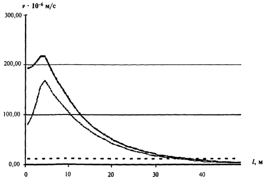 1 - вертикальная составляющая; 2 - горизонтальная составляющая; 3 - нормативное значение Рисунок Б.2 - Зависимость максимальной величины вертикальной и горизонтальной составляющих виброскорости v от расстояния до тоннеля l в октавном диапазоне 31,5 Гц 1 - вертикальная составляющая; 2 - горизонтальная составляющая; 3 - нормативное значение Рисунок Б.3 - Зависимость максимальной величины вертикальной и горизонтальной составляющих виброскорости v от расстояния до тоннеля l в октавном диапазоне 63 Гц ПРИЛОЖЕНИЕ В(справочное) ЭФФЕКТИВНОСТЬ НЕКОТОРЫХ ВИБРОЗАЩИТНЫХ УСТРОЙСТВТаблица В.1. - Значения эффективности некоторых виброзащитных устройств