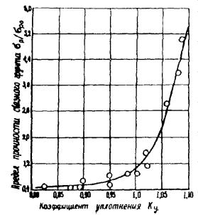 Зависимость относительной прочности связного грунта sр/sро и соответственно требуемых контактных давлений рабочих органов грунтоуплотняющих машин от его плотности (sро - предел прочности при Ку = 1) В табл. 5 приведены основные показатели уплотняющей способности машин, имеющихся в дорожно-аэродромном строительстве. Эти показатели соответствуют коэффициенту уплотнения грунта 0,95, для получения которого контактные давления машин могут составлять всего 60 - 70 % значений, необходимых для достижения Ку = 1. Для гарантированной реализации Ку = 1,03 ¸ 1,04 давления, соответствующие Ку = 1, должны быть увеличены в 1,5 - 1,7 раза, т.е. машины, в частности статического типа, должны быть минимум в 1,5 раза тяжелее. Например, наиболее распространенные пневмоколесные катки массой около 25 т могут уплотнить связные грунты до Ку = 0,95 при контактных давлениях (и соответственно при давлении воздуха в шинах) около 0,4 - 0,5 МПа. Для достижения Ку = 0,9 ¸ 1 контактные давления при той же массе 25 т следует повысить до 0,6 - 0,8 МПа, а для Ку = 1,03 - до 1 - 1,2 МПа при одновременном увеличении массы катка до 35 - 40 т. Таблица 5