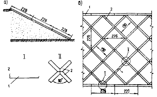 4.5. Толщину сборных элементов (рациональное сечение) определяют, исходя из условий работы решетчатой конструкции совместно с поверхностным слоем откоса неподтапливаемой или подтапливаемой насыпи, с учетом в последнем случае силовых воздействий вод, а также возможного изменения напряженного состояния или уменьшения прочности грунта в пределах активной зоны. Применяют сборные элементы сечением от 5 × 10 до 10 × 20 см, длиной от 1 до 2 м. При необходимости дальнейшего увеличения длины сборных элементов (по расчету) их целесообразно объединять в сборные рамы. 4.6. Минимальное сечение сборных элементов при требуемой длине определяют (в случае защитного типа конструкции) исходя из необходимой прочности при транспортировке и возможных деформациях при монтаже. Сечение можно выбрать на основе расчета сборного элемента как балки на двух опорах под действием собственной массы с коэффициентом динамичности, равным 1,5. 4.7. Чтобы воспринять сдвигающее усилие от действия массы всей решетчатой конструкции, а также грунтовой призмы в пределах активной зоны поверхностного слоя грунта, у подошвы земляного полотна располагают бетонный или железобетонный упор. Упоры могут быть монолитными сечением 30 × 40, 30 × 15 см или состоять из сборных блоков сечением 20 × 30 × 34 см. Такими упорами в определенных случаях могут служить сами сборные элементы, образующие нижний пояс. Упор выполняют либо сплошным ленточным, либо прерывистым, устанавливаемым только перед стыками нижних элементов по типу отдельных упорных зубьев или железобетонных сваек. Последний вид упора целесообразно использовать для облегченных решетчатых конструкций защитного типа с диагональным расположением элементов. 4.8. Длину штырей и сваек (от 0,5 до 2 м) назначают в зависимости от предполагаемой мощности активной зоны поверхностных слоев откоса, где прочность грунта может быть нарушена в результате циклических воздействий промерзания-оттаивания, увлажнения (набухания) - высушивания, а также силовых воздействий паводковых или текучих вод (подтапливаемые конусы и откосы). Металлические штыри выполняют из арматуры периодического профиля диаметром 20 - 35 мм, железобетонные свайки (см. табл. 6, варианты 1, а, б) диаметром 30 - 80 мм. 4.9. При комбинированных типах решетчатых несущих конструкций (в комбинации с анкерными затяжками или свайными полями) часть штырей (по расчету) заменяют анкерными затяжками или заделывают в ростверк свайного поля. В зависимости от предназначения сборных элементов арматуру в них выполняют в виде плоского или объемного каркаса из стержней диаметром от 4 до 8 мм. 4.10. Сборные решетчатые конструкции различают по видам в зависимости от области их использования и особенностей элементов (см. табл. 6). Это позволяет выбрать необходимый вариант с учетом назначения решетчатой конструкции для предотвращения развития локальных деформаций в поверхностных слоях откосов. 4.11. Бетонные плиты предназначены для защиты конусов путепроводов и откосов периодически подтопляемых насыпей от воздействия воды при скорости течения до 3 м/с и высоте волны до 0,6 м, при слабом ледоходе. Бетонные плиты применяют размером 1,0 × 1,0 × 0,16 и 1,0 × 1,0 × 0,2 м. Толщину и размеры плит назначают по расчету в зависимости от скорости течения воды, высоты волн и крутизны укрепляемого откоса. Бетонные плиты допускаетс