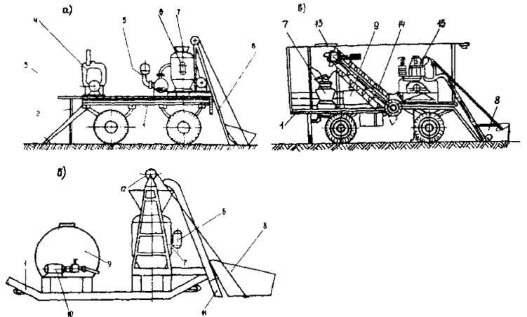 сборными бетонными плитами: 5.42. Для укладки и распределения стабилизированного грунта, обработанного вяжущими, рекомендуются машины, указанные в табл. 10 настоящих «Методических рекомендаций». 5.43. Рабочие смеси для укладки методом пневмонабрызга приготавливают из цемента, песка или гравия. Сухие смеси должны быть использованы в течение 2 - 4 ч с момента их приготовления. Смеси выгружают из самосвалов в накопительные бункеры или на металлические листы (во избежание попадания в смеси грунта или скальной породы) с последующей перегрузкой в бункеры бетон-шприц-машин типа СБ-67А или СБ-66, обеспечивающих их смешение с водой, подаваемой от насосной станции, укладку и уплотнение. Добавки-ускорители схватывания и твердения цемента в рабочие смеси для пневмонабрызга следует вводить вместе с водой затворения. 5.44. В связи с линейным характером укрепительных работ на объектах транспортного строительства комплект машин и механизмов для пневмонабрызга рекомендуется размещать на санях или на автоприцепе (рис. 6), предусмотрев возможность получения электроэнергии и воздуха от электростанций и передвижных компрессорных установок. 5.45. Основные операции на поверхности скального или грунтового откоса рабочие выполняют, находясь в специальной подвесной люльке на выносной стреле шарнирных автогидроподъемников МШТС-2А (3А). Рабочий управляет соплом, шарнирно закрепленным в люльке. 5.46. Процесс пневмонабрызга следует начинать с увлажнения через сетку подготовленной скальной поверхности с помощью воздушно-водяной струи. Рис. 6. Варианты передвижных бетонирующих комплектов: Расстояние от среза сопла до укрепляемой поверхности должно составлять 0,9 - 1,1 м, а струю бетона следует направлять перпендикулярно поверхности откоса. Для получения равномерного слоя защитного покрытия оператор в процессе набрызга должен перемещать сопло одновременно вкруговую и в горизонтальном направлении; толщина образуемого слоя обратно пропорциональна скорости таких перемещений. В первую очередь следует заполнять углубления на поверхности и выравнивать «рваный» профиль выемки. Монтажная сетка должна быть утоплена в набрызг-материале. Толщина слоя облицовки над сеткой - не менее 20 мм. Процесс пневмонабрызга следует осуществлять по возможности непрерывно. 5.47. В районах песчаных пустынь откосы и полосу отвода автомобильных дорог необходимо укреплять розливом жидких вяжущих материалов в следующем порядке: приготовлять на стационарной базе жидкие вяжущие материалы; доставлять вяжущие материалы к месту работ; приготовлять рабочий состав; распределять рабочий состав (медленнораспадающуюся битумную эмульсию) по закрепляемой поверхности. 5.48. Агрегат для розлива эмульсий должен состоять из тягача (трактора типа ДТ-75), размещенного на нем разбрызгивателя в виде дождевального аппарата и мотопомпы (пожарного автомобиля со сменными шлангами длиной до 250 м и брандспойтом), приемной цистерной вместимостью 10 - 15 м3, установленной на пневмоколесной тележке, сцепленной с тягачом. Площадь розлива с одной стоянки составляет 3 га. Уход за конструкциями укрепления5.49. При длительной засушливой погоде после гидропосева необходимо организовать искусственный полив (2 - 4 м3 воды на 100 м2 поверхности ежедневно) в течение 5 - 10 дней. На участках размывов и редкого травостоя следует 