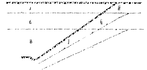 Начальными формами нарушения местной устойчивости могут быть трещины по бровке и поверхности откоса, срывы укрепления, незавершенные оплывы, которые могут служить очагами дальнейшего развития деформаций. Сплывы откосов возникают вследствие снижения прочности грунтов под влиянием физико-химического выветривания и избыточного увлажнения. Они проявляются обычно в виде смещения слоев грунта мощностью 0,4 - 0,8 м в неблагоприятное по погодным условиям время года (весной при оттаивании грунта, осенью и летом после затяжных или ливневых дождей и т.д.). Основными процессами физико-химического выветривания, ведущими к снижению прочности грунта в поверхностных слоях откоса, следует считать: промерзание и оттаивание грунтов; набухание и усадку грунтов при изменении влажности под действием климатических факторов (испарения, осадков, промерзания); диффузионное выщелачивание, вынос, перенос и отложение солей водой инфильтрующихся осадков и грунтовой водой; окисление минералов и соединений в грунте кислородом воздуха и инфильтрующейся водой. В результате протекания этих процессов изменяются состав (главным образом агрегатный и обменных катионов), состояние (структура, плотность, влажность), воднофизические свойства (водопроницаемость, характерные влажности и т.д.) и прочность грунта. Рис. 1. Схема образования зон активного выветривания в откосе после его сооружения В первые годы после сооружения земляного полотна процессы выветривания вызывают необратимые изменения свойств грунта, что затрудняет прогнозирование последних при инженерно-геологических изысканиях. Накопление необратимых изменений во времени происходит с постепенно затухающей интенсивностью. Характер и величина изменений состава, состояния и свойств грунта зависит от степени изменения условий его залегания. Если до сооружения выемки выделить зоны сезонного промерзания А (рис. 1), сезонного изменения влажности Б и толщу грунтов постоянного состава и состояния В (скорость изменения определяется геологическими процессами), после образования откоса интенсивность изменения свойств и состояния грунта будет особенно велика у подошвы (зона I), уменьшаясь по высоте откоса (зоны II и III). В особо невыгодных условиях оказываются грунты подошвенной части откоса, где наблюдаются повышенная влажность, концентрация касательных напряжений и накопление диспергирующих грунт водно-растворимых солей, вынесенных с верхних горизонтов. Характер изменения свойств и состояния грунта в насыпях зависит от степени изменения условий залегания после перемещения грунта из карьера или резерва в откос и от уплотнения грунта откосной части. Часто наблюдаемые на откосах насыпей и выемок срывы поверхностного укрепления объясняются значительным водонакоплением и образованием линз льда при промерзании на контакте рыхлого растительного слоя и плотного грунта откоса. Значительная плотность грунта препятствует проникновению корневой системы вглубь его и не обеспечивает достаточного сцепления дернового покрова с грунтом. Поверхностные воды и дождевые осадки, попадая на неукрепленный откос, вызывают эрозионные деформации его в виде смыва грунта, размывов, разжижения и стекания поверхностного слоя к подошве откоса и т.д. Опасность образования деформаций увеличивается с уменьшением с