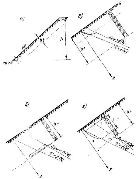 значения A и B определяются по графику рис. 3 главы III Указаний для стандартных заложений откосов и ξ = 0,05 - 0,30. При других откосах и ξ > 0,3, ξ < 0,05 значения A и B определяются по специальным формулам, учитывающим следующие предпосылки. а) При ξ < 0,10 расчет устойчивости производится в предположении бесконечного откоса с мощностью оползающего слоя hр (см. а на рисунке). В критических для устойчивости откоса условиях (обильные весенние дожди, бурное снеготаяние и т.д.) слой на всю глубину протаивания полностью водонасыщен, структурные особенности грунта (наличие микро- и макротрещин, большая начальная агрегированность и т.д.) позволяют учитывать взвешивающее давление воды. В этом случае значение A в формуле (1) главы III Указаний можно определить из выражения