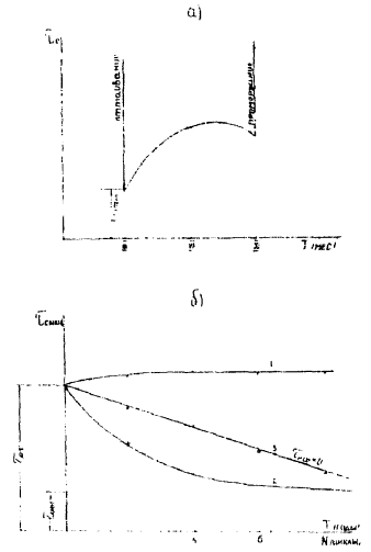 где Δв - удельный вес воды. Устойчивость считается обеспеченной при Kу ≥ 1. Оценка устойчивости против размывов производится только для тех объектов земляного полотна, укрепление откосов которых по тем или иным причинам не предусматривается проектом, или для тех грунтовых и климатических условий, когда для образования устойчивого травяного покрова требуется длительный срок. Возможность эрозионных деформаций оценивается по степени размываемости грунтов, слагающих поверхность откосов, с учетом условий воздействия на откос поверхностных вод. Предполагая, что нарушение устойчивости может произойти в форме эрозионных деформаций поверхности откоса, следует на основе данных о продолжительности и интенсивности выпадения дождей, гранулометрического состава грунтов, слагающих откос, высоты откоса и его крутизны установить скорость движения поверхностных вод по поверхности откоса. Полученную таким образом фактическую скорость Vфакт поверхностных вод необходимо сопоставить с предельно допустимой для данного грунта скоростью Vдоп. В том случае, если Vфакт < Vдоп можно считать, что местная устойчивость откоса обеспечена. Если Vфакт ≥ Vдоп, то возможны эрозионные деформации, которые могут быть предотвращены уменьшением крутизны откоса, назначением специального типа укрепления или комбинаций этих мероприятий (см. главу V). Методика определения Vфакт и значения Vдоп приведены в приложении 2. ГЛАВА IV. ОСОБЕННОСТИ ОПРЕДЕЛЕНИЯ РАСЧЕТНЫХ ПОКАЗАТЕЛЕЙ ГРУНТА ДЛЯ ОЦЕНКИ МЕСТНОЙ УСТОЙЧИВОСТИДля поверхностных слоев откосов земляного полотна после их сооружения характерным является изменение прочности грунта как по сезонам года, так и за многолетний период. Оценку устойчивости производят по расчетному значению минимальной сезонной прочности за многолетний период. На рис. 4 показан возможный характер изменения прочности по сезонам года (без внутрисезонных колебаний ее) и минимальное значение сезонной прочности за многолетний период. Для ненабухающих и слабо набухающих грунтов, не чувствительных к выщелачиванию солей и окислению минералов, изменение прочностных характеристик в результате промерзания - оттаивания и переувлажнения происходит в основном только по сезонам года и весьма незначительно за многолетний период. Некоторое ухудшение показателей, характеризующих структуру и состояние грунта (агрегированности, плотности и воднофизических свойств) компенсируется, как правило, улучшением условий залегания за счет осушения, развития дернового покрова и т.д. Для таких грунтов за расчетную прочность принимается минимальная сезонная прочность их в первый год после сооружения откоса τр(1) (кривая 1 на рис. 4б). За расчетную прочность грунтов набухающих и чувствительных к выщелачиванию солей и окислению соединений принимается ее асимптотическое значение за многолетний период τр(2) (кривая 2 на рис. 4б). Для некоторых грунтов, особочувствительных к физико-химическому выветриванию, падение прочности носит незатухающий характер (кривая 3 на рис. 4б). К таким грунтам относятся, например, некоторые разновидности меотических глин, дочетвертичных суглинков и т.д. Устойчивость сооруженных в них откосов не обеспечивается никаким уположением. В таких случаях принимается τр(3) = 0 и мероприятия по обеспечению устойчивости назначаются без пр