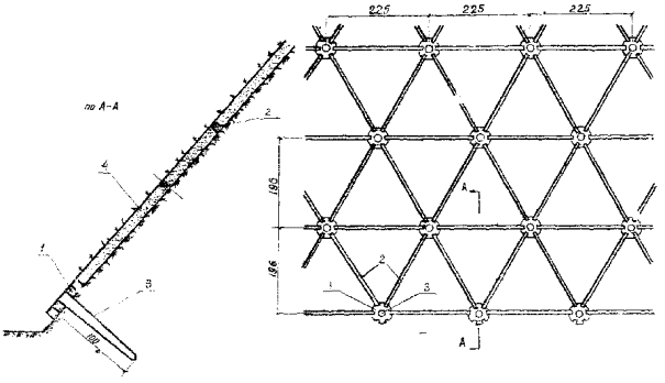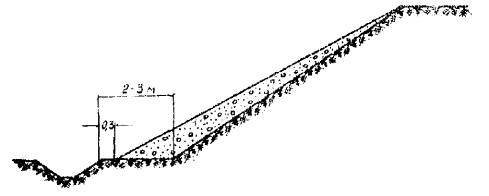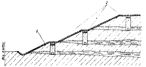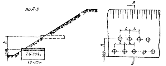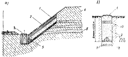 где K′м - коэффициент морозной чувствительности грунтов при влажности на пределе раскатывания; значения K′м принимаются равными для легких суглинков 1,3 - 1,4, для тяжелых суглинков 1,4 - 1,6, для глин 1,6 - 1,8; f - интенсивность пучения, %; если интенсивность пучения грунта в натуре не установлена, ее следует определить по таблице приложения 6; σ - нагрузка на оттаивающий грунт, кг/см2. При использовании литературных источников, материалов проектных и научно-исследовательских организаций для установления расчетных показателей состояния и прочности грунта особое внимание следует обращать на идентичность сравниваемых грунтов по генетическим признакам, составу и стадии выветривания. ГЛАВА V. МЕРОПРИЯТИЯ ПО ОБЕСПЕЧЕНИЮ МЕСТНОЙ УСТОЙЧИВОСТИ ОТКОСОВДля обеспечения местной устойчивости применяются следующие мероприятия: поверхностное укрепление откосов в соответствии с действующими указаниями, правилами и инструкциями - для малоопасных грунтовых условий; поверхностное укрепление откосов в соответствии с действующими указаниями и дополнительными требованиями настоящих Указаний - для опасных и особоопасных грунтовых условий; специальные мероприятия по обеспечению местной устойчивости для особоопасных грунтовых условий только в тех случаях, когда оценка устойчивости, произведенная в соответствии с положениями глав III и IV Указаний, показала, что при типовых заложениях откосов местная устойчивость их не обеспечивается; перехват и отвод грунтовых вод от земляного полотна до выхода их на откос; а также мероприятия, обеспечивающие суффозионную устойчивость откосов, когда оценка, проведенная в соответствии с положениями главы III, показала возможность образования выносов и суффозионных нарушений, а перехват и отвод воды проектом не предусмотрены. Основным видом поверхностного укрепления является обсев травами по слою растительного грунта [11, 12, 42, 65]. Для особоопасных и опасных грунтовых условий при укреплении поверхности откосов обсевом трав в проектах необходимо устанавливать дополнительные требования: посев трав должен производиться в лучшие агротехнические сроки при увеличенной норме высева кондиционных семян с тем, чтобы до наступления сплывоопасного периода было обеспечено образование дернового покрова хорошего качества; укладку растительного грунта следует производить на минеральный грунт откоса, не нарушенный физико-химическим выветриванием. Если между сроком готовности откоса (или отдельных участков) и лучшим агротехническим сроком его укрепления существует разрыв во времени, достаточный для нарушения природного сложения и прочности грунта процессами физико-химического выветривания на глубину более 0,15 м, рекомендуется оставлять на откосах предохранительный слой, не дорабатывая выемки по ширине. Толщина предохранительного слоя назначается в соответствии с положениями главы III настоящих Указаний исходя из длительности воздействия климатических факторов на грунты откоса. Непосредственно перед укреплением откоса предохранительный слой убирают и укрепление производят по ненарушенному слою грунта. Если по условиям производства работ лучшие агротехнические сроки посева не могут быть соблюдены во избежание развития значительных деформаций в особоопасных и опасных грунтовых условиях допускается укрепл