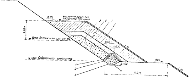 минеральной составляющей грунта, hгр - глубина промерзания грунта к началу оттаивания, м; Wл - предел льдовыделения, %; Cл - теплоемкость льда, Cв - теплоемкость воды, τ - время оттаивания, час; Wт - содержание замерзшей воды в мерзлом грунте от объемного веса скелета грунта, %; W - влажность грунта, %; α - коэффициент, учитывающий условия теплоотдачи с поверхности откоса. Значения параметров определяются также, как и при вычислении глубины промерзания грунтов по формуле В. С. Лукьянова. С момента окончания оттаивания откосов происходит просачивание талых вод, которое заканчивается после схода снегового покрова. Прирост влажности за это время может быть определен по методике Союздорнии [55, 56]. После чего по допускаемой величине влажности в пучащих грунтах устанавливается состав, плотность и толщина защитной обсыпки. При рассчитанной указанным образом толщине защитного слоя жидкие атмосферные осадки, выпадающие весной, не будут оказывать влияния на водный режим защищаемого грунта. Поэтому не требуется каких-либо дополнительных мероприятий по защите грунтов от этих осадков. За требуемую толщину защитного слоя принимается наибольшая величина, полученная из указанных трех условий. Пример. Определить необходимую толщину защитного слоя для района участка Кировоград-Первомайск автомобильной дороги Полтава-Кишинев. 1. По данным метеостанций в Первомайске толщина снежного покрова в защищенных местах, где влияние ветра на условия залегания снежного покрова не сказывается, изменяется от 2 см в первой декаде до 7 см в январе-феврале. В Кировограде толщина снежного покрова изменяется от 2 см в первой декаде декабря до 8 см в январе. Пренебрегая влиянием снегового покрова и используя карту Л. Т. Абрамова, определяем глубину промерзания для данного района - 0,7 м. Таким образом, по первому критерию толщина защитного слоя должна быть не менее 0,7 м. 2. Глубина, где отсутствует колебание суточных температур, равняется в среднем 0,9 м. Таким образом, с точки зрения второго критерия необходимо, чтобы защитный слой имел толщину не менее 0,9 м. 3. Расчет по третьему условию показывает, что при применении в защитном слое супеси, толщина его должна быть не менее 1,5 - 3 м (в зависимости от плотности). Таким образом, защитный слой в данном случае необходимо устраивать из супеси и толщина его не должна быть менее 1,5 м (при плотности 0,98 от наибольшей плотности, полученной по методу стандартного уплотнения). Однако при окончательном назначении конструкции защитного слоя следует иметь в виду, что поверхность самого защитного слоя должна быть также укреплена. Укрепление поверхности снижает впитывание. Поэтому для соблюдения третьего условия не обязательно делать толщину слоев 1,5 - 3 м, как получилось по расчету. Практически ее можно принять равной максимальной величине, определяемой первым и вторым условием, т.е. до величины порядка 0,9 - 1,0 м. Приложение 5Рекомендации по устройству в откосах горизонтальных дрен из трубофильтровГоризонтальные дренажи в виде скважин, обсаженных трубофильтрами, рекомендуется применять для предупреждения сплывов на откосах, сложенных переувлажненными глинистыми грунтами, а также на откосах, где наблюдается высачивание грунтовых вод с малым дебитом при отсутствии четко выраженных водоносных горизонтов. Дренажные скважины снимают избыточ