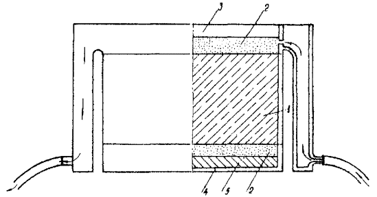 На полке размещают водоотводные устройства для сбора и отвода воды, поступающей с верховой стороны откоса. Приложение 3Основные положения по имитированию процессов физико-химического выветривания в лабораторных условияхПромораживание рекомендуется проводить в специальном приборе, позволяющем промораживать образцы только сверху. В зависимости от типа конструкции земляного полотна (насыпь или выемка) гидрогеологических условий и консистенции грунта в условиях естественного залегания промораживание может проводиться как для условий открытой системы, т.е. с подтоком влаги к фронту промерзания, так и без подтока влаги (закрытая система). В последнем случае образец грунта предварительно насыщается водой. Промораживание образцов производится при температуре минус 5 - 6° до полного промерзания образца, оттаивание производится при комнатной температуре. Набухание и высушивание образцов в простейшем случае производится в приборе предварительного уплотнения без нагрузки под водой. Ход набухания фиксируется по индикатору. После завершения набухания образцы вместе с кольцами выгружают из прибора предварительного уплотнения, взвешивают, устанавливают в эксикатор над водой на 1 сутки, после чего подвергают высушиванию, например в сушильном шкафу, до постоянного веса. Высушенные образцы снова загружаются в прибор для последующего набухания. Если в реальных условиях наблюдается совместное действие набухания-усадки и промерзания-оттаивания, набухший образец промораживают, а после его оттаивания - высушивают. Диффузионное выщелачивание глинистых грунтов производится в приборе Ф. Ф. Лаптева (рисунок). В прибор помещают образец грунта высотой 5 - 7 см с омываемой поверхностью 70 см2. По поверхности образца через песчаный фильтр пропускается с постоянным расходом (0,5 - 1,0 л/сутки) дистиллированная вода (или вода заданного состава). Продолжительность выщелачивания устанавливается периодическим сравнением содержания солей (например, измерением удельной электропроводности) фильтрата и воды на входе прибора. По окончании процесса выщелачивания содержание солей в воде на входе и выходе выравнивается. После выщелачивания один из серии образец грунта подвергается испытанию на прочность, другие в зависимости от условий залегания подвергаются дополнительному промораживанию-оттаиванию или набуханию-высушиванию, как это было указано выше.