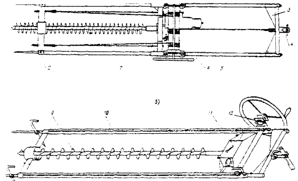 При этом должно соблюдаться условие 1,0 ≤ Lр(1) ≤ 2,0. При высоте откоса более 4 м скважины устанавливаются в 2 ряда. Расстояние между скважинами в ряду Lр(2) при этом увеличивается Lр(2) = 1,8 Lр(1). Расстояние между рядами скважин по высоте hc принимается равным расстоянию между скважинами при однорядном их расположении hc = Lр(1). Процесс устройства горизонтальных дрен в откосах включает в себя: подготовительные работы; бурение горизонтальных скважин; обсадку скважин трубофильтрами. Подготовительные работы состоят из доставки трубофильтров и бурового станка на объект, разбивки местоположения горизонтальных скважин на откосе и распределения трубофильтров на местах будущих дрен. Бурение горизонтальных скважин осуществляется переносными станками ЦНИИ-2, ПВБСм-15 или другими станками подобного типа. Для обеспечения высокой производительности при бурении большого числа горизонтальных скважин в конструкции станков ЦНИИ-2 и ПВБСм-15 следует внести небольшие изменения. Эти изменения сводятся или к установке тяговой лебедки на вращателе и двух блоков на нижней обвязке (см. а на рисунке) или к устройству реечного зацепления (см. б на рисунке). Это позволяет легко регулировать механическую пригрузку шнека при бурении. Указанные изменения могут быть выполнены в любой мастерской. Бурение осуществляется шнеками, диаметр которых больше диаметра трубофильтров на 9 - 12 мм. Скважины глубиной до 1,5 м бурятся одним шнеком, при большей глубине шнек наращивается дополнительной штангой. Для этой цели при малых оборотах двигателя хвостовая часть шнека выводится из обоймы вращателя, шнек остается в скважине, а вращатель отводится назад, шнек наращивается штангой и бурение продолжается. При достижении заданной глубины скважины, не останавливая вращения шнека, вращатель отводится назад, станок снимается и переносится на место другой скважины. Обсадка производится вручную путем проталкивания в скважину трубофильтров, состоящих из коротких отрезков длиной 0,5 м. Все работы по устройству горизонтальных дрен выполняются бригадой из трех человек. Два рабочих обслуживают буровой станок, один обсаживает скважины трубофильтрами. В зависимости от длины дрен и грунтовых условий производительность бригады за смену составляет 80 - 150 дрен.
