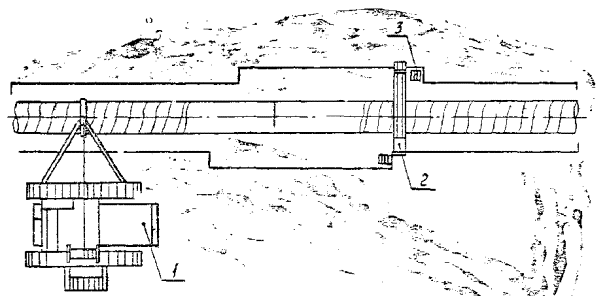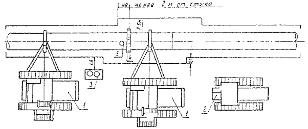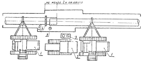 Каждый слой шва перед наложением последующего необходимо тщательно зачистить от шлака шлифовальной машинкой. Облицовочный шов обивают от шлака пневмозубилом. На шве не должно оставаться незаваренных кратеров. Шов должен быть без подрезов. Высота усиления шва должна составлять от 1 до 3 мм (в зависимости от стенки трубы). 2.7. В качестве источника питания для сварки стыков используют самоходные двухпостовые сварочные установки СДУ-2В. 2.8. Работы по изоляции захлестов и катушек производят после контроля качества сварных стыков в следующей технологической последовательности (рис. 3): подчищают вручную готовый приямок; приподнимают трубоукладчиком плеть на высоту 400 - 500 мм над дном траншеи и удерживают в этом положении; очищают места изоляции длиной 2,5 м от ржавчины, грязи и полимерной ленты; приготовляют грунтовку и наносят на место изоляции; изолируют трубопровод вручную двумя слоями полимерной ленты и защитной оберткой. Рис. 3. Схема организации работ при изоляции захлеста и катушки: 1 - трубоукладчик; 2 - переходной мостик; 3 - лестница. Изоляция, нанесенная вручную, должна иметь плавный переход к изоляции основного трубопровода, нанесенной механизированным способом. 2.9. По окончании изоляционных работ трубопровод плавно опускают в траншею. 2.10. Для выполнения комплекса работ по монтажу, сварке и изоляции захлестов и катушек организуют бригаду в составе 12 человек с переменным составом звеньев. 2.11. Методы и приемы труда рабочих по монтажу, сварке и изоляции захлестов и катушек в карте не представлены и разрабатываются в отдельных картах трудовых процессов. 2.12. Графики выполнения работ приведены в табл. 3 и 4. 2.13. Калькуляции трудовых затрат составлены на основании норм и расценок сборника В 31 и представлены в табл. 5 и 6. Примечание. При выполнении работ в условиях, не предусмотренных картой, в нормах времени и расценках учитываются коэффициенты, указанные в табл. 2. Таблица 2