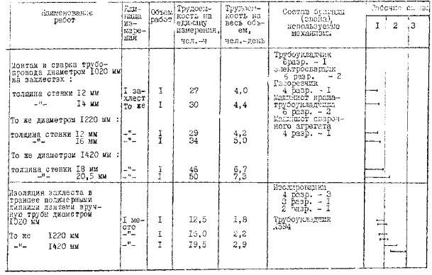 МИНИСТЕРСТВО СТРОИТЕЛЬСТВА ГЛАВНОЕ ТЕХНИЧЕСКОЕ УПРАВЛЕНИЕ ПРОЕКТНО-ТЕХНОЛОГИЧЕСКИЙ ИНСТИТУТ ТИПОВАЯ ТЕХНОЛОГИЧЕСКАЯ КАРТА Москва 1981 Типовая технологическая карта устанавливает технологию и организацию работ по ликвидации технологических разрывов при строительстве магистральных трубопроводов диаметрами 1020, 1220 и 1420 мм. В технологической карте рассмотрены вопросы организации и технологии строительного процесса; приведены технико-экономические показатели, график выполнения работ, калькуляции трудовых затрат, материально-технические ресурсы, требования по технике безопасности, схемы производства работ. Карта предназначена для производителей работ, мастеров, рабочих, а также организаций, разрабатывающих проекты производства работ. Работа выполнена отделом магистральных трубопроводов. Технологическая карта согласована с отделом охраны труда и техники безопасности Министерства строительства предприятий нефтяной и газовой промышленности 4 сентября 1980 г. ВведениеТиповая технологическая карта на ликвидацию технологических разрывов при строительстве магистральных трубопроводов входит в комплекс типовых технологических карт на строительство линейной части магистральных трубопроводов диаметрами 1020 - 1420 мм в нормальных условиях. Карта разработана в соответствии с требованиями СН 47-74 и Руководством по разработке типовых технологических карт в строительстве. Квалификация исполнителей и тарификация выполняемых ими работ приняты в соответствии с Тарифно-квалификационным справочником, утвержденным Государственным Комитетом Совета Министров СССР по вопросам труда и заработной платы. Калькуляции трудовых затрат составлены в соответствии с Ведомственными нормами и расценками на строительные, монтажные и ремонтно-строительные работы [7]. При разработке карты использована основная нормативная и техническая литература [1 - 12]. I. ОБЛАСТЬ ПРИМЕНЕНИЯ1.1. Типовая технологическая карта разработана на ликвидацию технологических разрывов при строительстве магистральных трубопроводов диаметрами 1020 - 1420 мм. 1.2. При разработке типовой технологической карты приняты следующие исходные положения: толщина стенок труб диаметром 1020 мм - 12 и 14 мм; то же 1220 мм - 12 и 16 мм; - » - 1420 мм - 18 и 20,5 мм. Трубы изготовлены из спокойных и полуспокойных низколегированных сталей с пределом прочности до 55 кгс/мм2. Монтаж, сварку и изоляцию технологических захлестов и врезку катушек производят в траншее. Вид и конструкция изоляционного покрытия - двуслойное из липких полимерных лент. 1.3. В состав работ, рассматриваемых картой, входят: монтаж и сварка трубопровода на захлестах; врезка и сварка катушек; изоляция катушек и захлестов в траншее вручную. 1.4. Работы выполняются в летний период (в условиях равниной местности и грунтах естественной влажности) и ведутся в одну смену продолжительностью 6,82 ч. 1.5. Привязка типовой технологической карты к конкретным условиям строительства должна включать: учет сезона производства работ; определение производительности труда при условии изменения сменности работ; расчет калькуляции трудовых затрат с использованием поправочных коэффициентов для выполнения работ в усложненных условиях с применением технологии и организации, предусмотренной картой на нормальные условия; учет объемов работ, средств механизаци