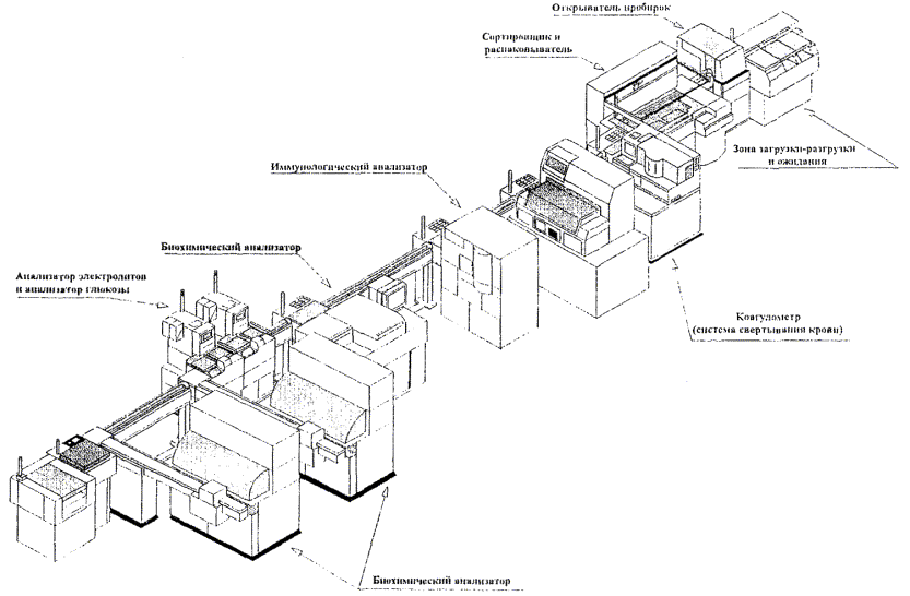 4. НОРМАТИВНЫЕ ССЫЛКИВ настоящем выпуске Пособия приведены ссылки на следующие документы: 1. СНиП 2.08.02-89* «Общественные здания и сооружения» 2. СНиП 2.04.05-91* «Отопление, вентиляция и кондиционирование» 3. СанПиН 2.1.3.1375-03 «Гигиенические требования к размещению, устройству, оборудованию и эксплуатации больниц, родильных домов и других лечебных стационаров» 4. МГСН 4.12-97 «Лечебно-профилактические учреждения». 5. Выпуски 1, 2 и 3 Пособия к МГСН 4.12-97 6. МГСН 2.01-99 «Энергосбережения в зданиях. Нормативы по теплозащите и тепловодоэлектроснабжению». 7. ОСТ 91500.13.0001-2003 «Правила проведения внутрилабораторного контроля качества количественных методов исследований с использованием контрольных материалов». Приложение 1Варианты компоновки современного лабораторного оборудования в единую производственную линиюРис. 1.1 Вариант компоновки оборудования лаборантской для биохимических, гормональных, иммунологических исследований и для коагулологии Габариты оборудования - 3,5 ´ 15,1 м. Рис. 1.2. Вариант компоновки оборудования лаборантской для биохимических, гормональных, иммунологических исследований и для коагулологии Габариты оборудования - 3,5 ´ 8,0 м. Приложение 2Схема взаимосвязей основных групп помещений паталогоанатомических отделений