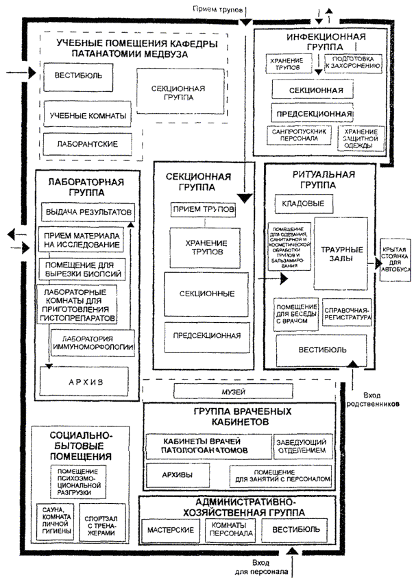 3. БЮРО (ОТДЕЛЕНИЯ) СУДЕБНО-МЕДИЦИНСКОЙ ЭКСПЕРТИЗЫ3.1. Бюро (отделения) судебно-медицинской экспертизы - учреждение здравоохранения особого типа, основная деятельность которого направлена на обеспечение потребностей правоохранительных органов в производстве судебно-медицинских экспертиз (СМЭ). В структуру Бюро СМЭ входят: - отдел СМЭ живых лиц; - отдел СМЭ трупов с гистологическим отделением; - отдел сложных экспертиз; - отдел СМЭ вещественных доказательств со следующими отделениями и лабораториями: - судебно-биологическое отделение; - судебно-химическое отделение; - судебно-биохимическое отделение; - судебно-бактериологическое (вирусологическое) отделение; - медико-криминалистическое отделение; - спектральная лаборатория; - лаборатория судебно-медицинских молекулярно-генетических исследований. По заданию на проектирование структура Бюро СМЭ может быть сокращена или дополнена. 3.2. Здание Бюро СМЭ должно располагаться на отдельной территории площадью не менее 1 га. На территории Бюро СМЭ необходимо предусматривать: гараж для служебных машин, склады для хранения горюче смазочных материалов, легковоспламеняющихся веществ, помещения для хранения гробов и других предметов ритуала, контейнерную площадку для мусоросборников. Кроме того, на территории Бюро СМЭ следует предусмотреть стоянку автотранспорта для дневной парковки автомашин персонала, родственников и представителей правоохранительных органов, а также стоянку ритуальных автобусов. Указанные стоянки должны размещаться на расстоянии не менее 25 м от жилых домов. Территория Бюро СМЭ подлежит ограждению, озеленению и благоустройству. 3.3. Расстояние от здания Бюро СМЭ до жилых домов и общественных зданий должно быть не менее 50 м. Здание Бюро СМЭ, а также подъезд к нему должен быть изолирован от прилегающих жилых домов и не просматриваться из окон как жилых домов, так и палат ЛПУ. Расстояние от здания Бюро СМЭ до других зданий ЛПУ следует принимать, как правило, не менее 30 м. При строительстве новых зданий Бюро СМЭ на территории действующих больниц, по согласованию с органами Госсанэпиднадзора, допускается уменьшение этого расстояния. 3.4. Планировка помещений должна обеспечить зонирование основных отделов, отделений и лабораторий Бюро СМЭ. 3.5. Отделение экспертизы живых лиц осуществляет: - экспертизу степени тяжести телесных повреждений; - экспертизу стойкой утраты трудоспособности; - экспертизу половых состояний и половых преступлений. В составе этого отделения должны быть предусмотрены кабинеты врачей судмедэкспертов и кабинеты врачей консультантов общего и узкого профилей. 3.6. Площадь кабинетов врачей судмедэкспертов и врачей консультантов следует принимать с учетом специальности врача, по нормам, предусмотренным для врачебных кабинетов амбулаторно-поликлинических учреждений. 3.7. В Бюро СМЭ должны предусматриваться помещения: - для хранения одежды трупов до решения органов милиции об их уничтожении; - для хранения частей трупов с холодильными камерами; - низкотемпературная холодильная камера для длительного хранения трупов. 3.8. К помещениям Бюро СМЭ предъявляются те же требования, что и к аналогичным помещениям паталогоанатомических отделений. 3.9. Структура Бюро СМЭ состоит из следующих групп помещений: - административно-хозяйственная группа; - группа кабин