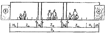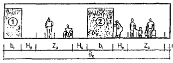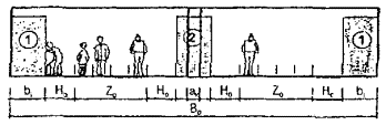 Приложение Б(обязательное) РАСЧЕТ ПРОПУСКНОЙ СПОСОБНОСТИ И ОСНОВНЫХ ПЛАНИРОВОЧНЫХ ПАРАМЕТРОВ ПОПЕРЕЧНОГО СЕЧЕНИЯ ПЕШЕХОДНЫХ ПЕРЕХОДОВ РАЗЛИЧНЫХ ТИПОВ1. Основные планировочные параметры поперечного сечения проектируемых пешеходных переходов должны обеспечивать беспрепятственный и безопасный пропуск фактических (существующих) и прогнозных (ожидаемых) пешеходных потоков по направлению (направлениям) трассировки перехода. В настоящем приложении дана методика определения пропускной способности и основных планировочных параметров поперечного сечения существующих и проектируемых пешеходных переходов с учетом размещения ОТС. Общие положения расчета. Требования к исходным данным 2. В расчете выделяются три основных этапа: - подготовка исходных данных; - расчет ширины основной зоны пешеходного движения; - расчет общей ширины пешеходного перехода и элементов поперечного сечения. 3. Исходные данные должны включать: - ситуационный план; - данные о фактической интенсивности пешеходного движения, полученные на основе натурных обследований; - величину проточной интенсивности пешеходного движения, полученную на основе расчетов с учетом сложившейся и прогнозируемой транспортно-градостроительной ситуации, программы дорожно-мостового строительства, перспективной застройки прилегающих территорий; - объемно-планировочное и конструктивное решения пешеходного перехода (для проектируемых переходов - предварительное решение); - варианты компоновки ОТС в пешеходном переходе; - ориентировочные габариты ОТС, площадь которых определяется с учетом положений Приложения А, а также пп. 7.9 - 7.12 настоящих Норм. 4. Определение расчетной интенсивности пешеходного движения в пешеходном переходе (Nр) проводится в соответствии с п. 3.16 раздела 3 настоящих Норм. 5. Определение пропускной способности пешеходного перехода проводится следующим образом: 5.1. Количество полос движения пешеходов в основной зоне пешеходного перехода (m) определяется по формуле [2] табл. Б1. Учитывается только количество полноценных полос движения, равное целой части полученной в результате расчета величины. 5.2. Ширина основной зоны пешеходного движения (Zo) определяется по формуле [1] табл. Б1. 5.3. Пропускная способность пешеходного перехода (Рo) определяется по формуле [3] табл. Б1. Примечание. В случае, если принимается схема размещения ОТС в пешеходном переходе, не представленная в табл. Б.1, расчет ведется по аналогии с приведенными примерами. Существующие пешеходные переходы 6. Для существующих пешеходных переходов, как правило, определяется: - пропускная способность перехода (без ОТС или с ОТС), которая затем сопоставляется с величиной расчетной интенсивности пешеходного движения в этом переходе; - допустимость размещения ОТС (на основе проведенного сопоставления); - ширина зоны размещения ОТС для различных вариантов их компоновки. 7. Решение о соответствии параметров существующего пешеходного перехода имеющемуся пешеходному потоку принимается на основе сопоставления величин пропускной способности пешеходного перехода (Po) - (п. 3.17) и расчетной интенсивности пешеходного движения (Np) - (п. 3.16). 8. Возможность (допустимость) размещения и ширина зоны ОТС в поперечном сечении пешеходных переходов определяются исходя из обеспечения пропуска пешеходного потока, характеризующег
