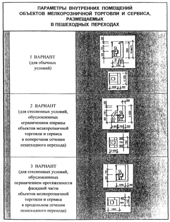 7.10. В обычных условиях ширину внутреннего помещения киоска в поперечном сечении следует принимать не менее 1300 мм, включая: ширину помещения для размещения рабочего места работника торгово-сервисного объекта - 1000 мм, глубину стеллажа для выкладки товаров - 300 мм. Ширину внутреннего помещения киоска по его фасадной части следует принимать не менее 1500 мм, включая: ширину помещения для размещения рабочего места работника торгово-сервисного объекта - 900 мм, стола для установки кассового аппарата - 300 мм, стола или стеллажа, размещаемого с противоположной стороны киоска, - 300 мм. 7.11. В стесненных условиях, обусловленных ограничением ширины ОТС в поперечном сечении пешеходного перехода, допускается принимать ширину внутреннего помещения киоска в поперечном сечении - не менее 900 мм; при этом стеллаж у задней стенки киоска предусматривать не следует. В этом случае ширину внутреннего помещения киоска по его фасадной части следует принимать не менее 1300 мм, включая: ширину помещения для размещения рабочего места работника ОТС - 700 мм, стола для установки кассового аппарата - 300 мм, стола или стеллажа, размещаемого с противоположной стороны киоска, - 300 мм. 7.12. В стесненных условиях, обусловленных ограничением протяженности фасадной части ОТС в продольном сечении пешеходного перехода, допускается принимать ширину внутреннего помещения киоска в поперечном сечении не менее 1400 мм, включая: ширину помещения для размещения рабочего места работника ОТС - 1100 мм, глубину стеллажа для выкладки товаров - 300 мм. В этом случае ширину внутреннего помещения киоска по его фасадной части следует принимать не менее 1100 мм, включая: ширину помещения для размещения рабочего места работника ОТС - 800 мм, стола для установки кассового аппарата - 300 мм; при этом с противоположной стороны киоска торговое оборудование, как правило, размещать не следует. 7.13. Высота ОТС определяется высотой пешеходного перехода, но должна составлять не менее 2200 мм. Пол помещения торгово-сервисного объекта следует устраивать на высоте 100 мм от уровня пола пешеходного перехода. 7.14. Нижний край окна выдачи товаров, устраиваемого в стене или двери, следует предусматривать, как правило, на расстоянии 900 мм от уровня пола пешеходного перехода. Высоту следует принимать, как правило, 700 мм, ширину - 600 мм. Над окном выдачи следует устраивать металлическую решетку или жалюзи; при этом высота удерживающего устройства не должна превышать 200 мм. 7.15. При размещении места сидения работника ОТС следует обеспечивать расстояния: от фасада киоска до спинки стула - не менее 700 мм, от спинки стула до задней стенки киоска или размещаемого там стеллажа - не менее 300 мм. 7.16. Установку осветительных приборов следует производить на высоте не менее 2000 мм от пола пешеходного перехода. 7.17. Ширину дверного проема следует устраивать не менее 800 мм. Загрузку товаров следует производить через дверной проем. 8. ИНЖЕНЕРНОЕ ОБОРУДОВАНИЕ. ПРОТИВОПОЖАРНЫЕ ТРЕБОВАНИЯ. ОБЕСПЕЧЕНИЕ БЕЗОПАСНОСТИВодоснабжение и водостоки8.1. По длине подземных пешеходных переходов и у сходов для сбора ливневых и сточных (в частности после промывки полов) вод следует устраивать водоприемные приямки и смотровые колодцы, из которых воду по водосточным и дренажным асбестоцементным трубам отводят в герметичную емкость. Водоприемные приямки перекрывают 