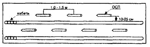 МОСКВА Введение.Настоящие рекомендации подготовлены на основании выполненных ВНИИПО МВД РФ в 1990 - 1993 гг. Работ по созданию огнетушителей самосрабатывающих порошковых (ОСП) и результатов натурных испытаний. 1. Общие положения.В соответствии с правилами пожарной безопасности Российской Федерации НПБ 01-93 огнетушители ОСП предназначены для тушения пожаров вместо переносных огнетушителей или дополнительно к ним в замкнутых помещениях объемом до 50 м3. ОСП выпускается по ТУ 4854-002-08378309-93 и эксплуатируются согласно паспорта НТ304.000 ПС. Компоненты заряда ОСП нетоксичны и по степени воздействия на организм человека соответствуют 3 классу опасности по ГОСТ 12.1.007-76. 2. Назначение ОСП.2.1. ОСП предназначен для тушения без участия человека, загораний огнетушащим зарядом с порошком типа ПСБ-3 горючих жидкостей (класс пожара В), газов (класс пожара С) и электрооборудования, а огнетушащим зарядом с порошком типа Пирант-А, также твердых материалов (класс пожара А) в небольших по объему технологических, складских и бытовых помещениях, шкафах с электрооборудованием и других замкнутых объемах. 2.2. Тушению огнетушителями не подлежат щелочные и щелочноземельные металлы, а также вещества, горение которых может происходить без воздуха. 3. Основные технические характеристики ОСП.3.1. Огнетушители в зависимости от температуры срабатывания соответствуют следующим типам: ОСП-1 с температурой срабатывания............................................................... 105 °С; ОСП-2 с температурой срабатывания............................................................... 200 °С; 3.2. Объем, защищаемый одним огнетушителем, м3............................................. 5 - 8 3.3. Диапазон температур эксплуатации, °С............................................ от -50 до +50 3.4. Габаритные размеры корпуса, мм: - диаметр, не более.................................................................................................. 54 - длина, не более..................................................................................................... 500 3.5. Масса заряженного ОСП, кг, не более................................................................. 1,2 4. Устройство и принцип действия ОСП.4.1. Огнетушитель ОСП представляет собой герметичный стеклянный сосуд, заполненный огнетушащим порошком и газообразователем, устанавливаемый горизонтально с помощью держателя над местом возможного загорания или равномерно по объему исходя из норм п. 3.2. 4.2. ОСП срабатывает под воздействием тепла непосредственно от очага горения. При возникновении загорания и нагреве газообразователя (желтый слой) до 100 или 200 °С, в зависимости от марки огнетушителя, последний разлагается, давление в сосуде возрастает, что приводит к разрушению сосуда и выбросу огнетушащего порошка. 4.4. Для обеспечения противопожарной защиты небольших технологических объектов, например, шкафов с электрооборудованием, ОСП размещают по одному в каждой отдельной секции. 4.5. Для защиты вводов и выводов горизонтальных кабельных трасс рекомендуется размещать огнетушители из расчета один ОСП на 1,0 - 1,5 метра длины кабеля, оптимальное расстояние от огнетушителя до кабеля составляет 10 - 20 см. Огнетушители начинают размещать на расстоянии не более 1 м от места ввода, вывода кабеля. В случае защиты нескольких горизонтальных уровней кабельных трасс, рекомендуется размещать ОСП в шахматном порядке согласно схеме, представленной на рис. 1. При установке ОСП на вертикальных участках кабельных трасс огнетушители размещают в шахматном порядке как с внешней, 